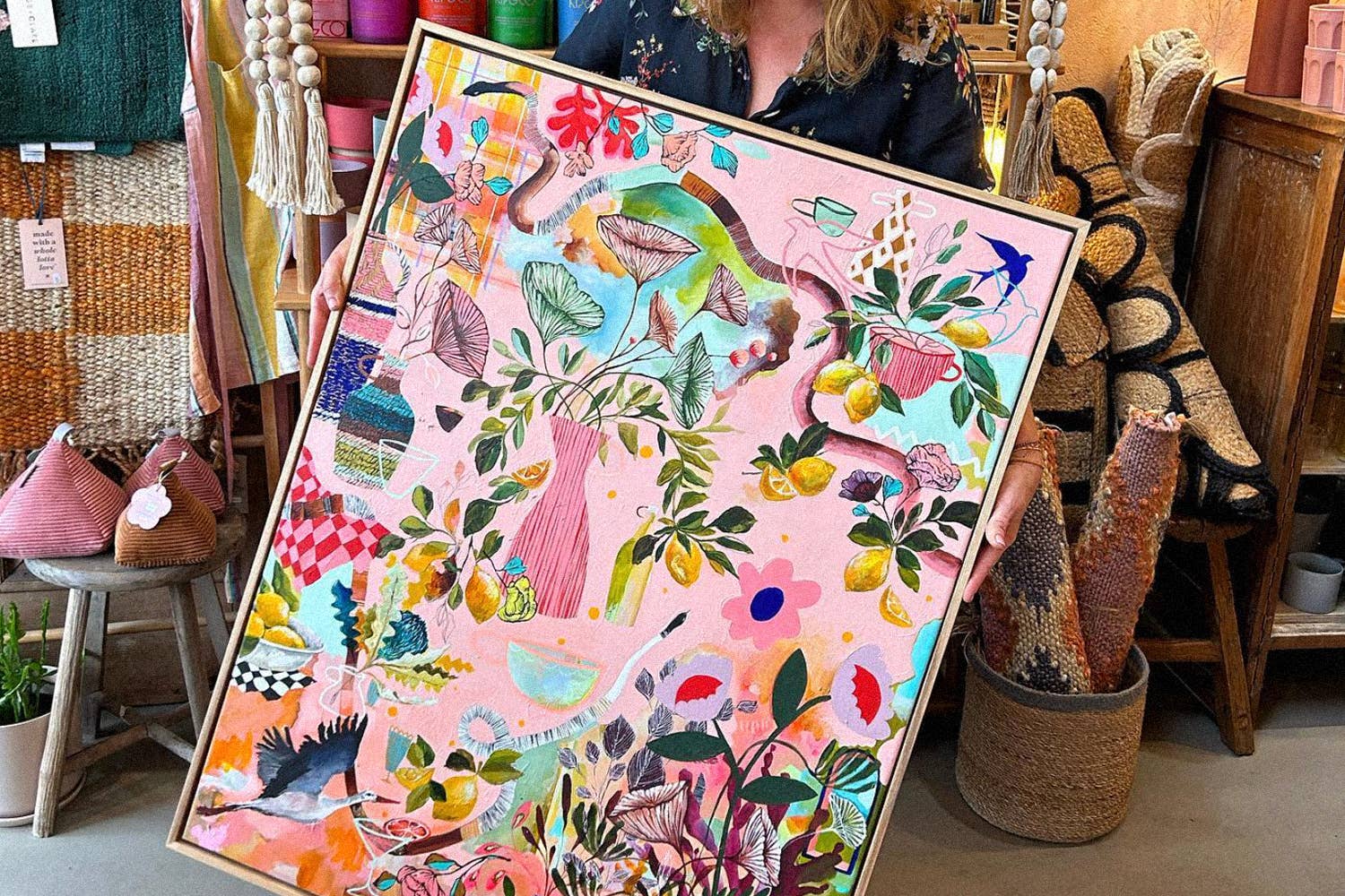 Georgia Pendlebury is an artist, creator and lover of all things colourful, unique, bold and happy. She has been creating art and styling spaces for as long as she can remember. Georgia says about this piece, " I have been playing with this piece for months (slightly time poor!) and it's finally done. It's a bit fun, slightly bonkers and full of all my fave colours." See Georgia with her original artwork in the pics!