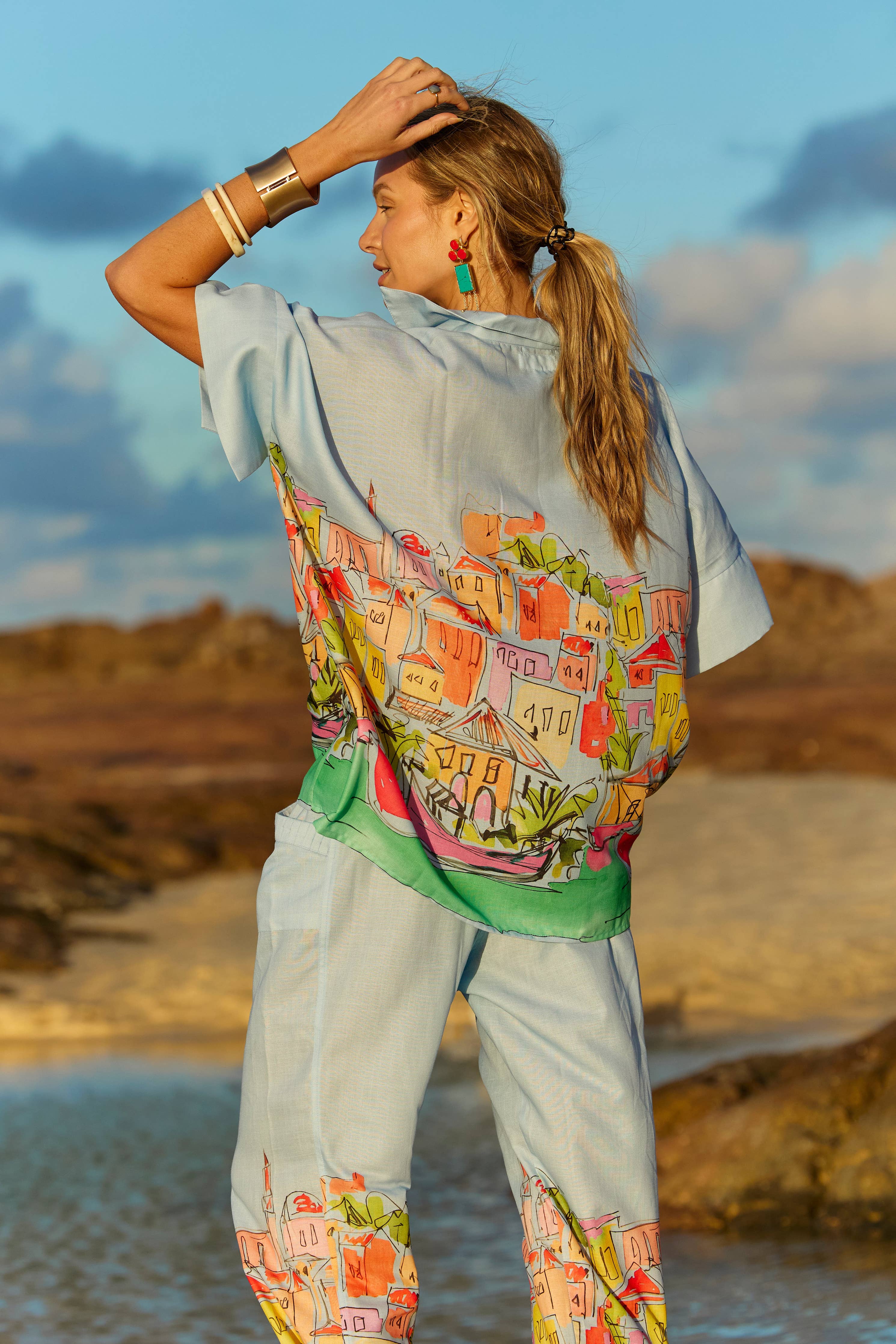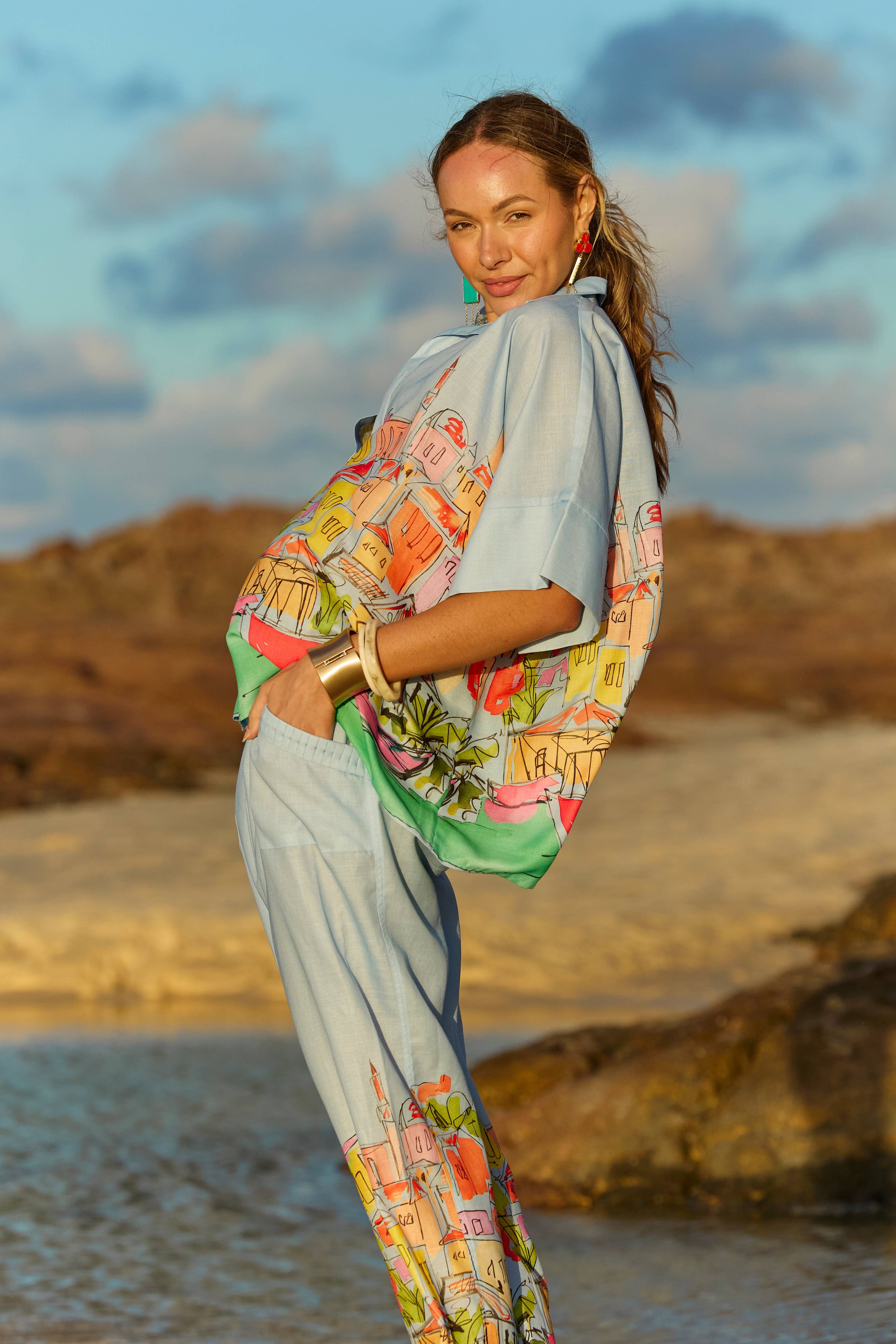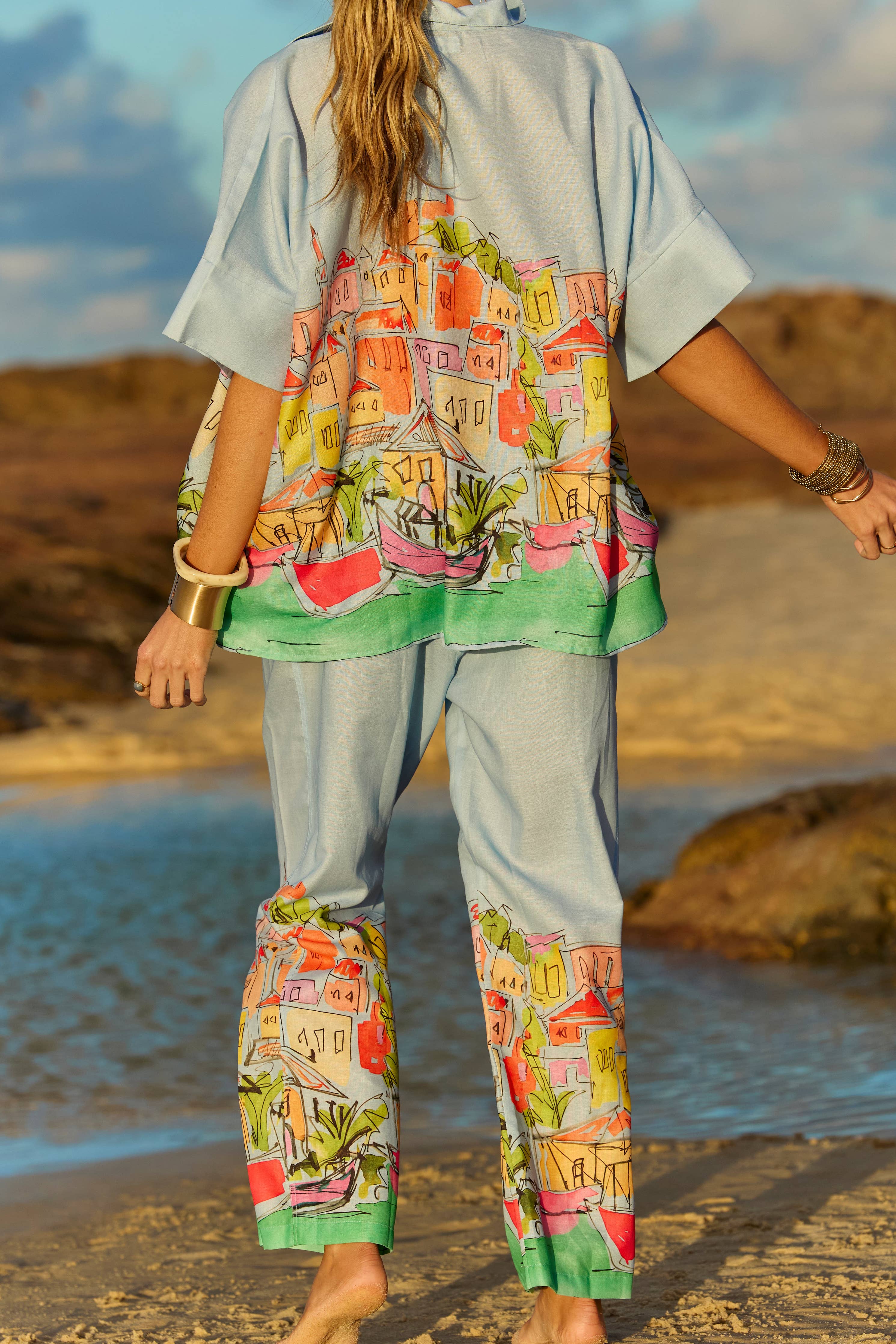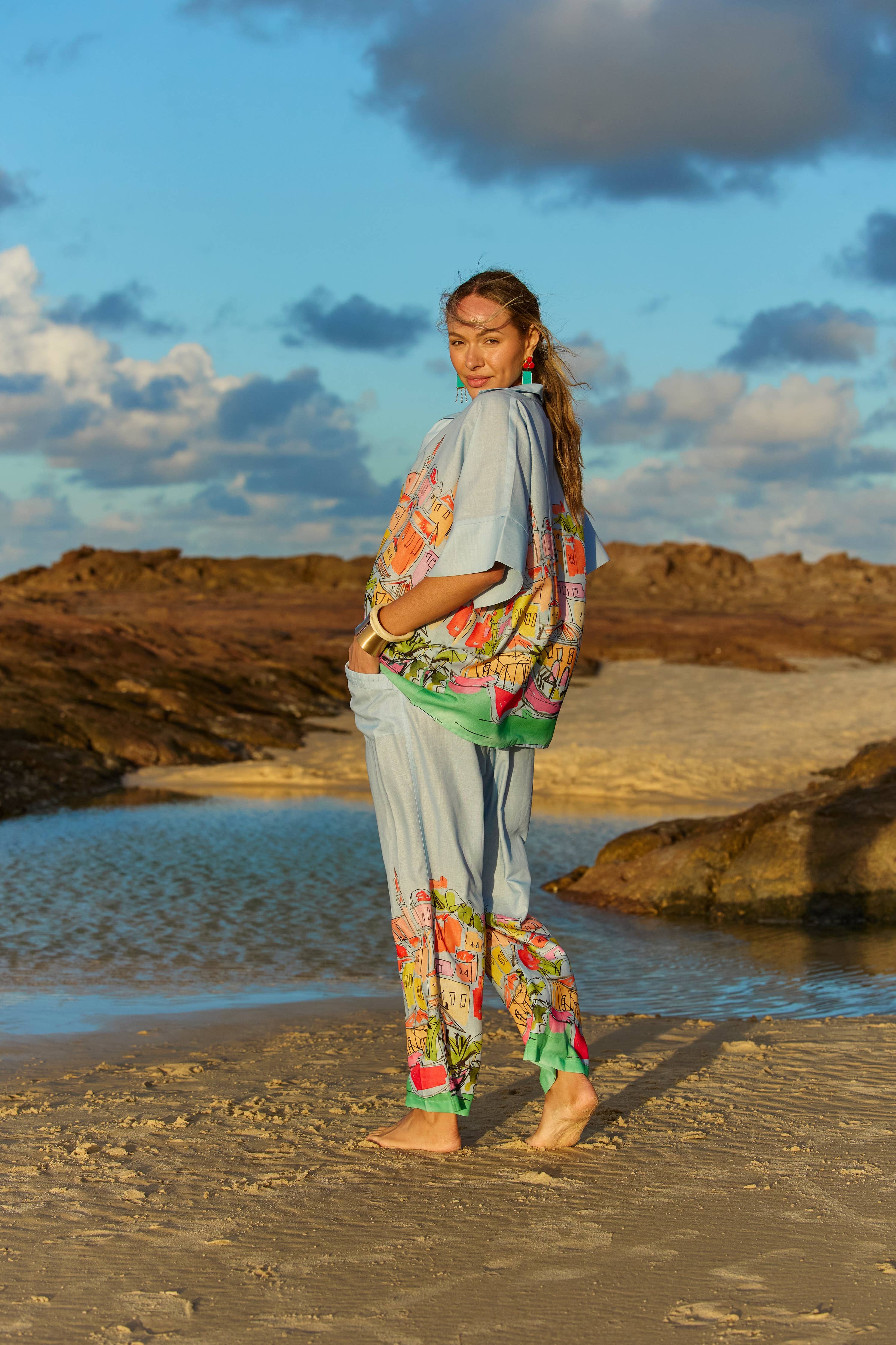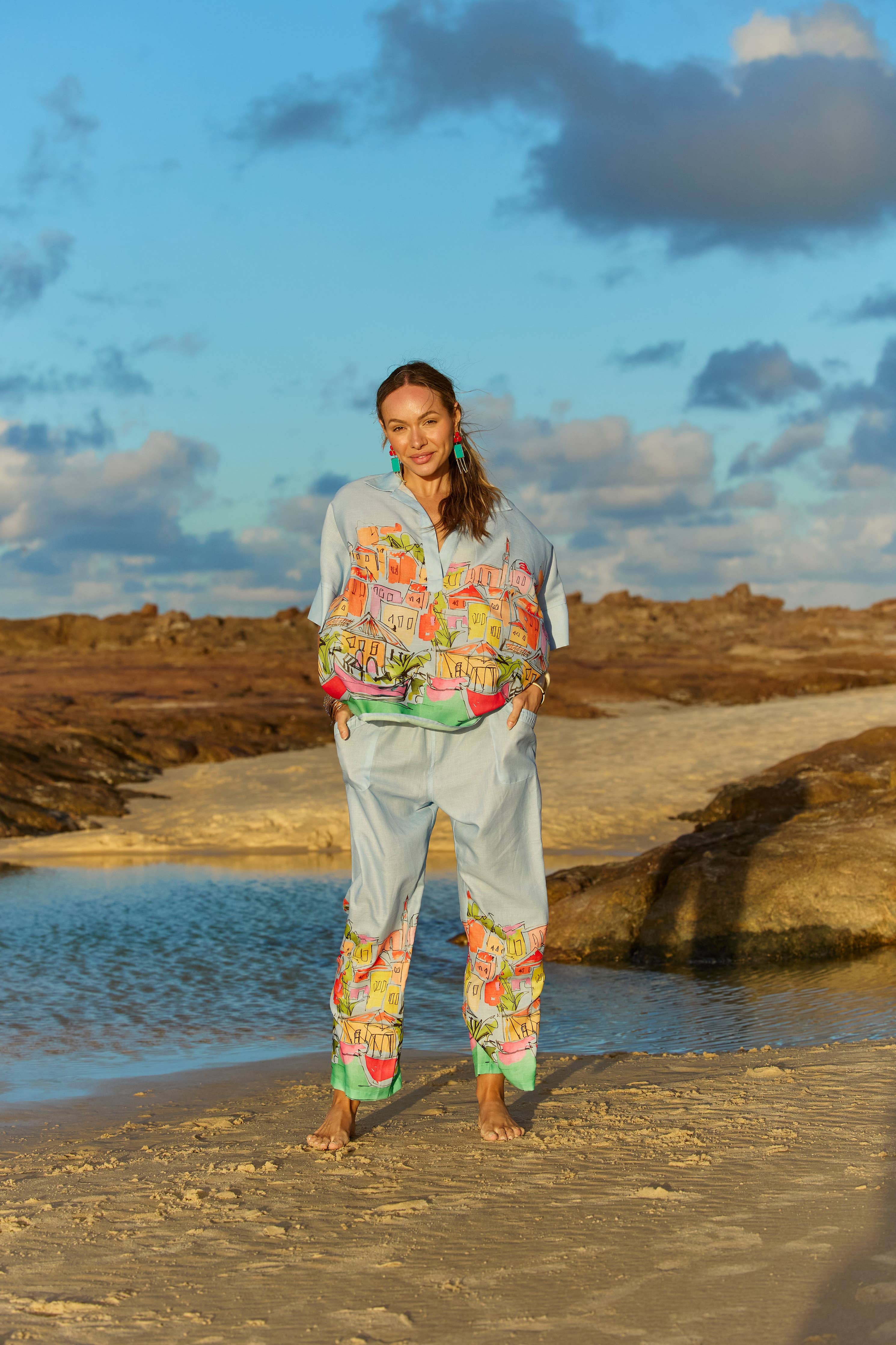 The Villa Print transforms these pants into a wearable artwork—vibrant village scenes painted in soft, uplifting tones that celebrate travel, creativity and the beauty of faraway places. The colours catch the light beautifully, giving the pants a joyful, playful energy. Pair them with a simple white top for an effortless statement, or style them with the Cassie Top in Villa Print for a coordinated set that radiates Naudic charm.