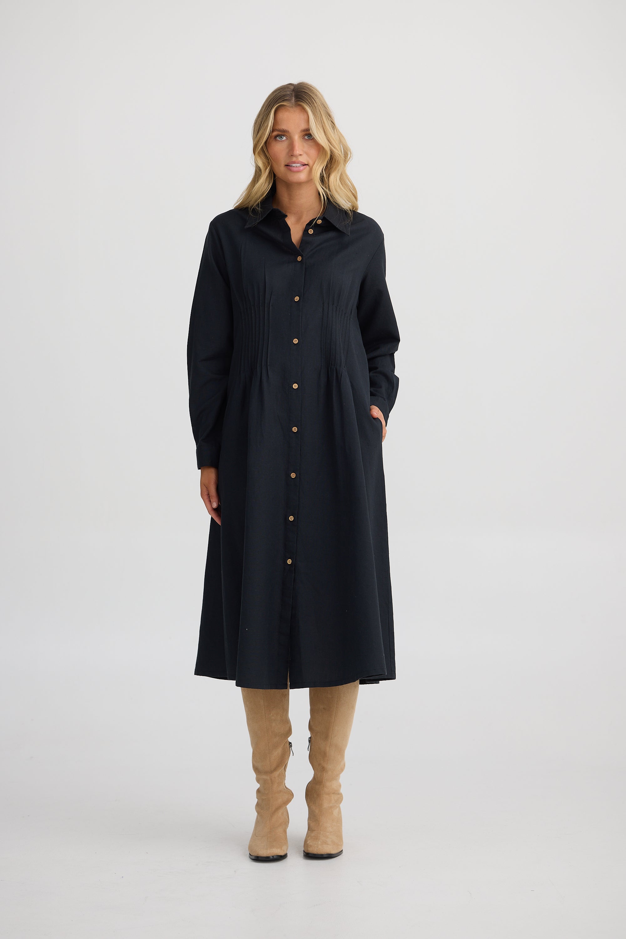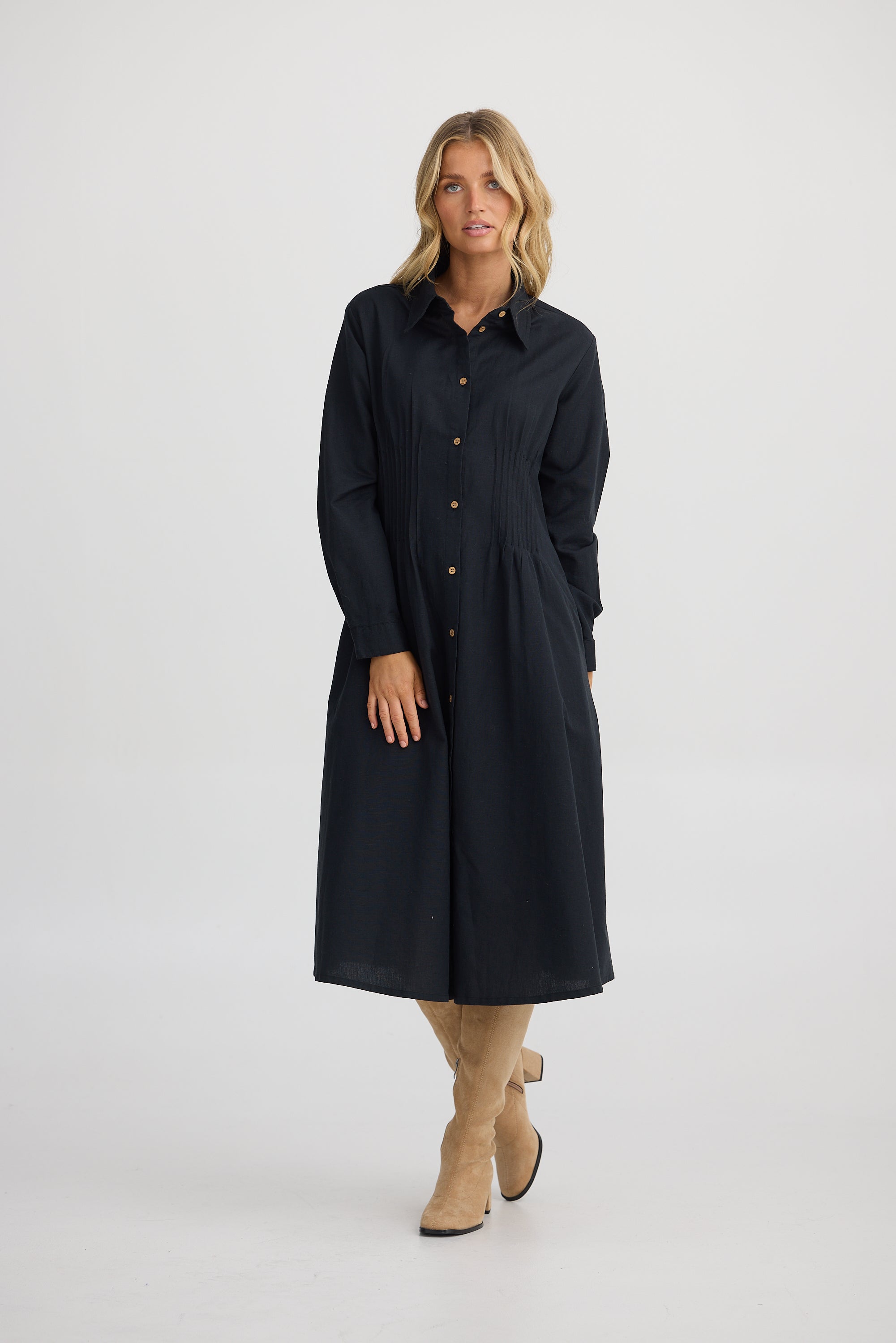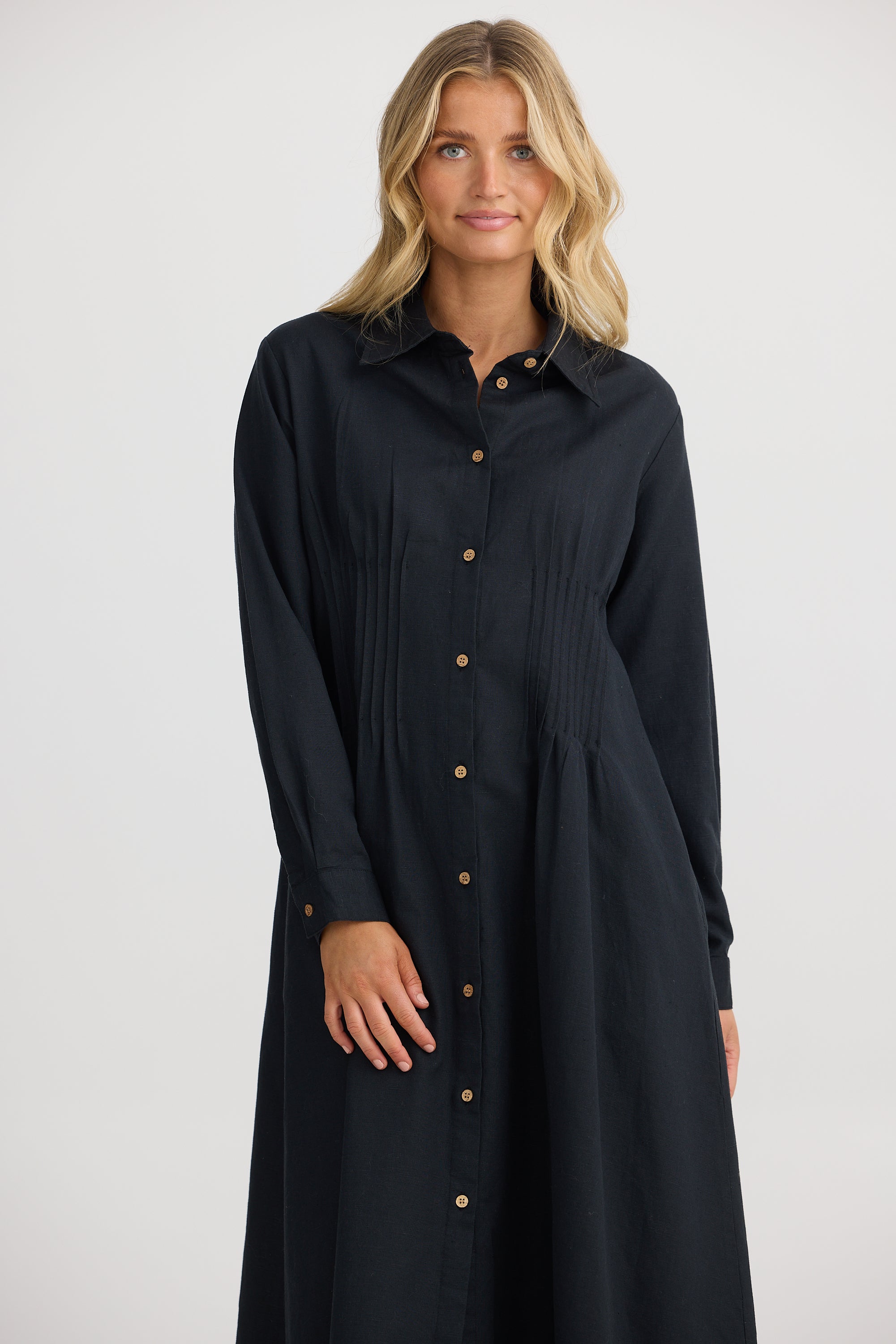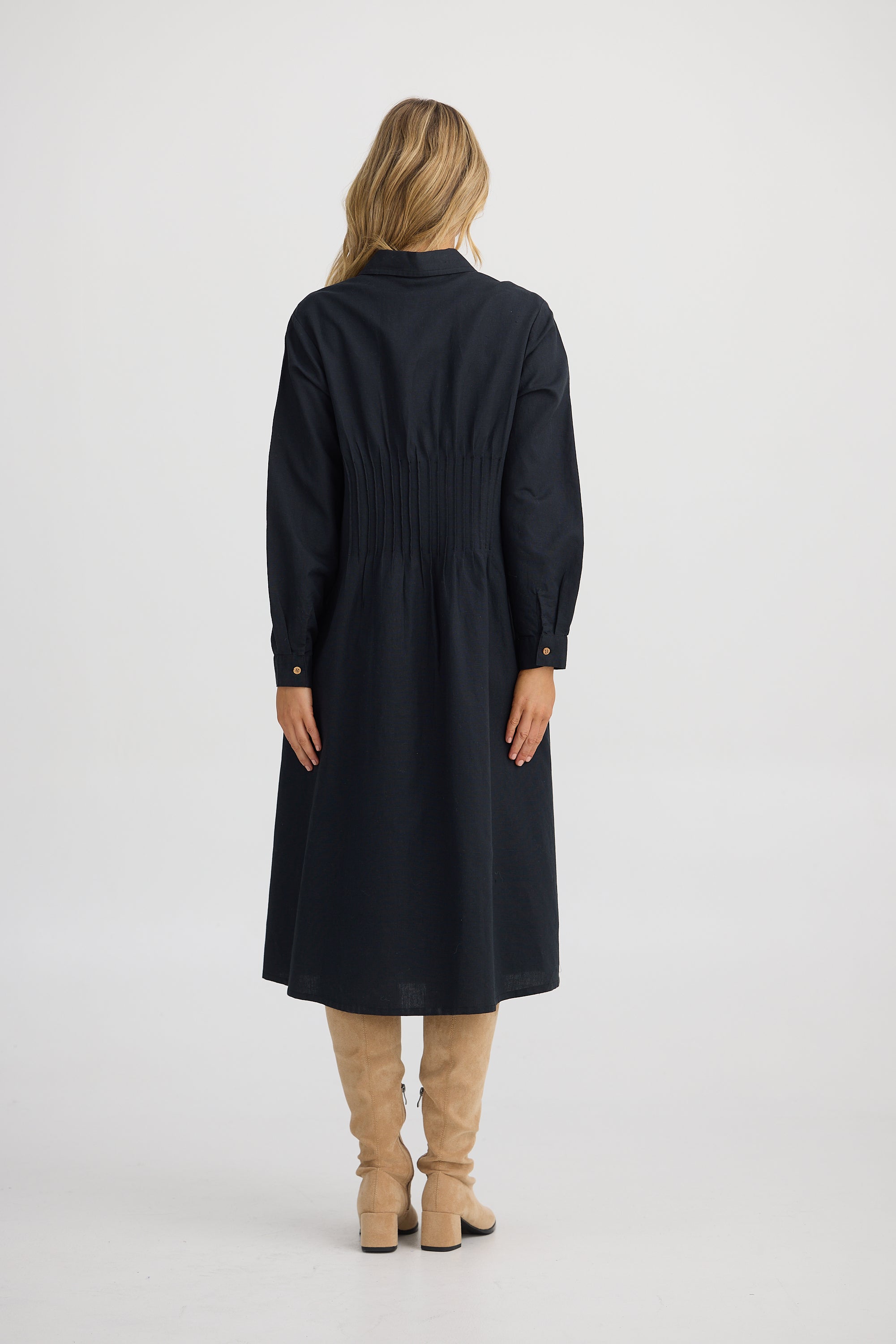 Delicate pintuck detailing through the front adds structure and charm, while the shirred back ensures a comfortable and flattering fit that gently shapes the waist. The long sleeves with functional cuffs add a polished finish, making the Caroni Dress your go-to for both relaxed and refined occasions.