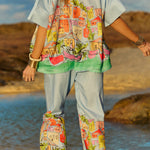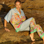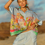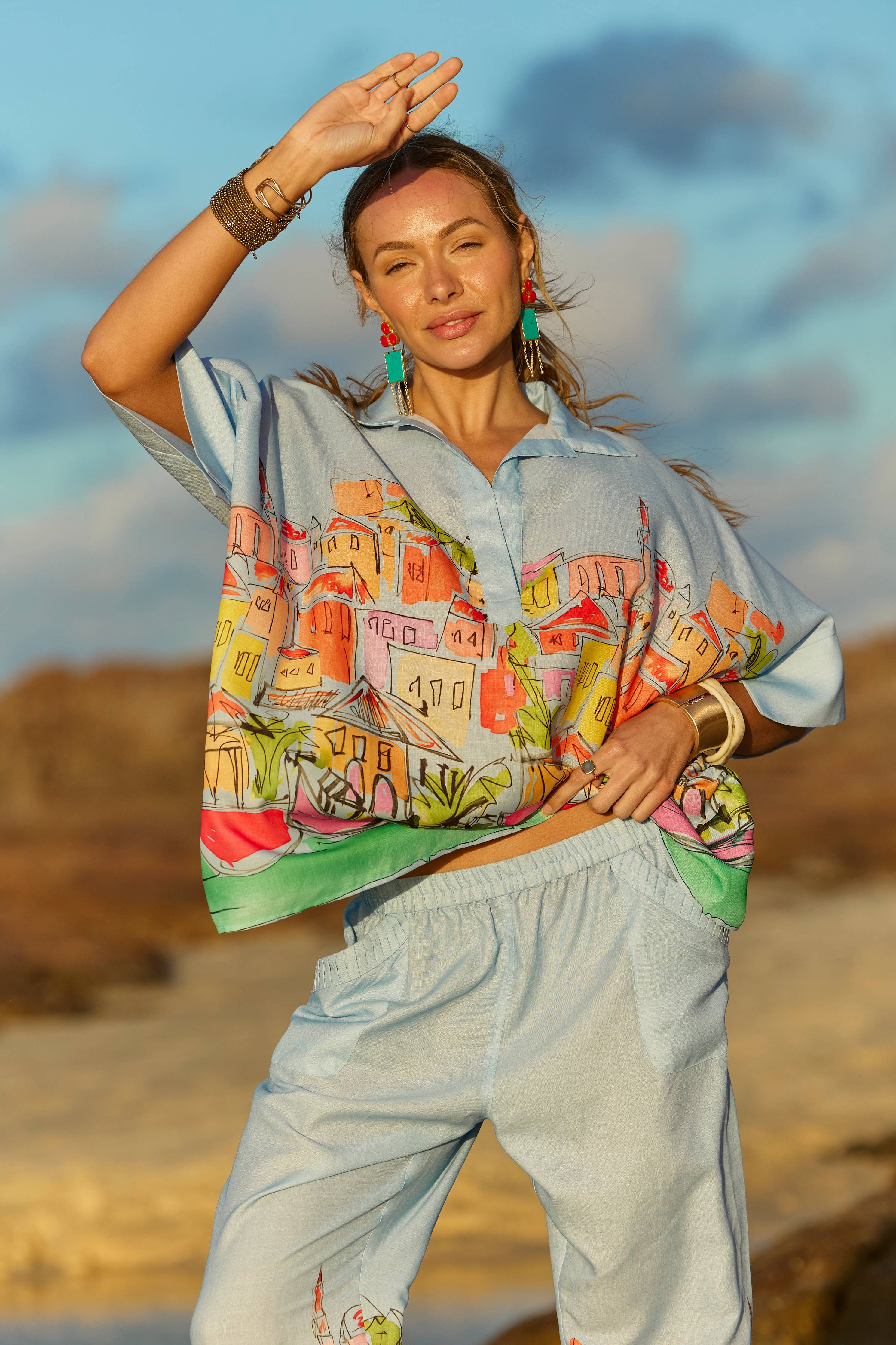 The Villa Print is inspired by sunlit seaside towns—pastel houses, winding laneways and warm holiday moments captured in painterly strokes. Every detail brings a sense of escape and wanderlust, making the Cassie Top the perfect piece for slow mornings, weekend adventures or travel days where comfort meets personality. Style it with your favourite denim or pair it with the matching Annie Pant for a striking, coordinated look that feels effortlessly elevated.