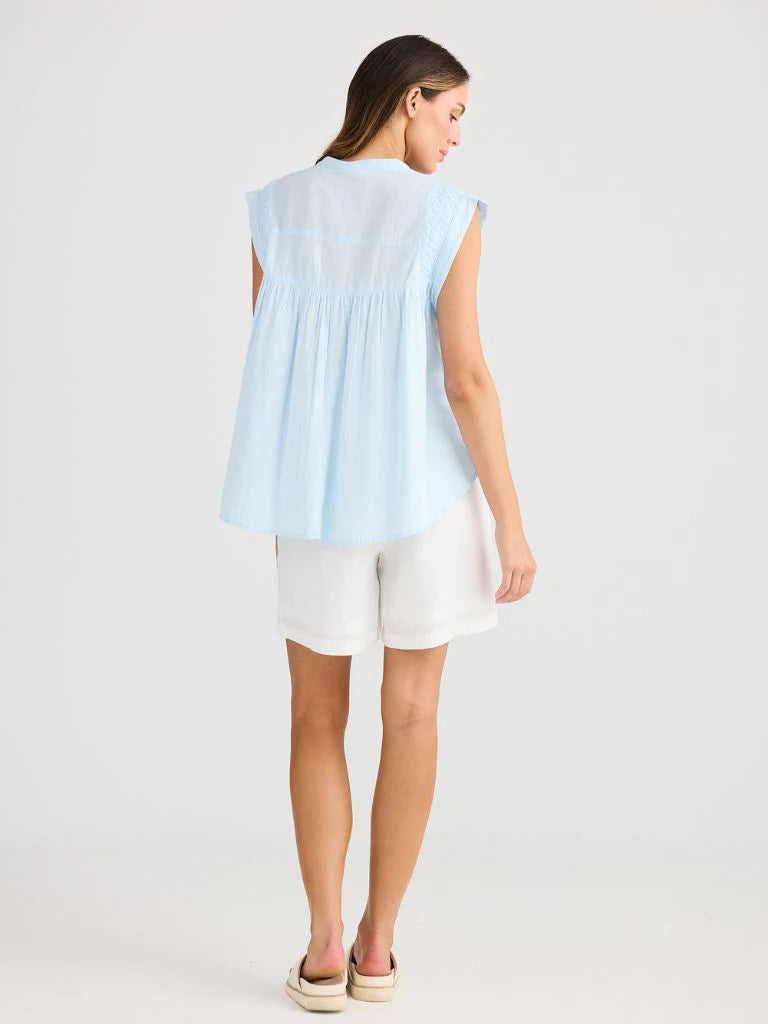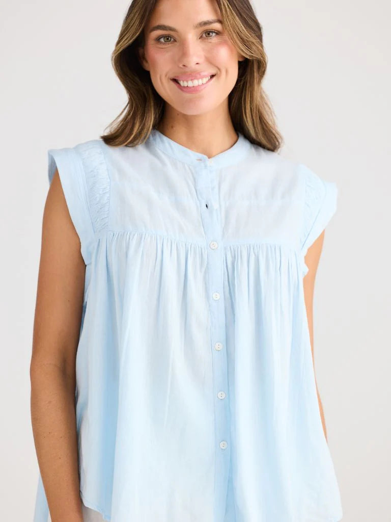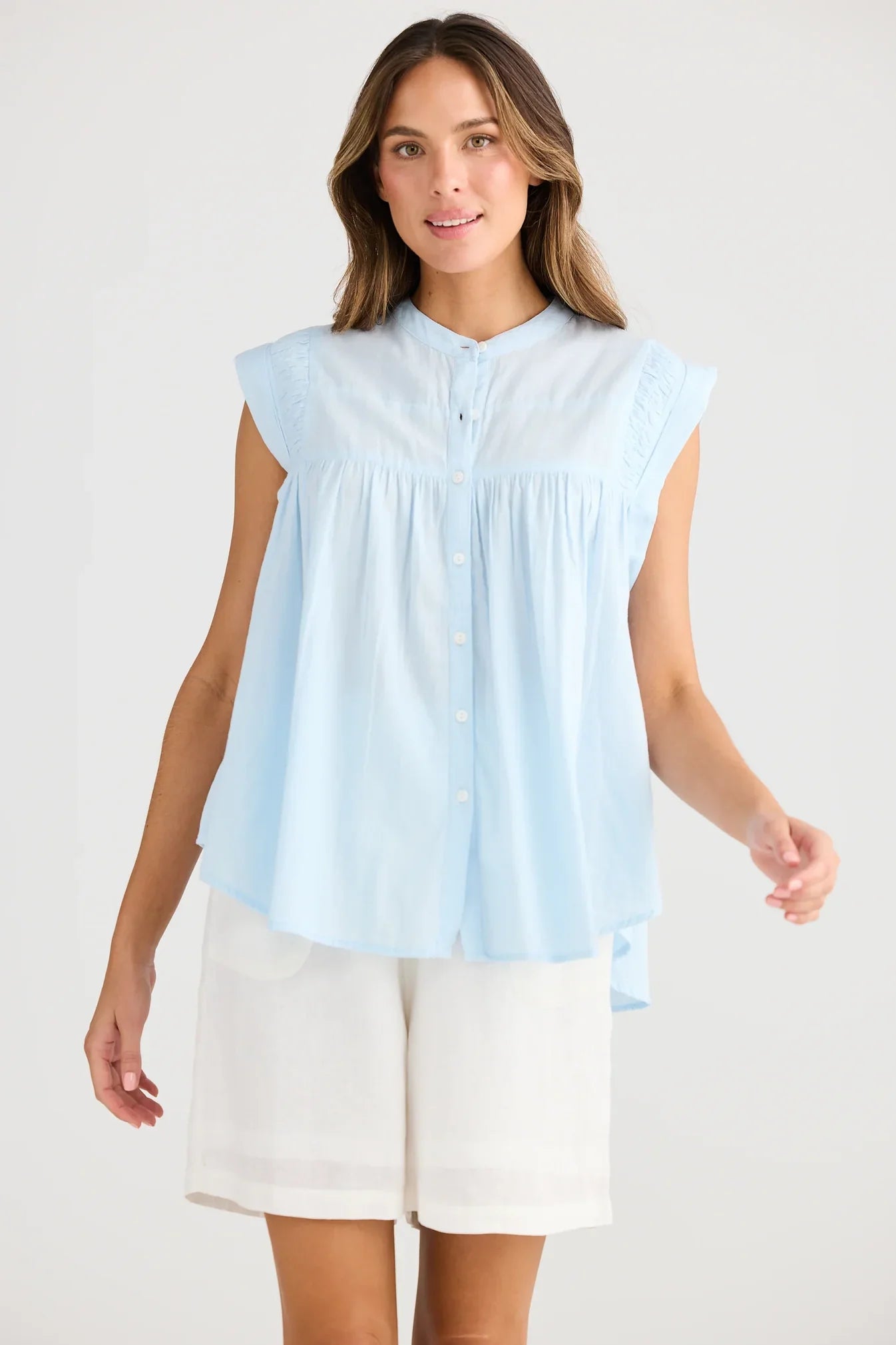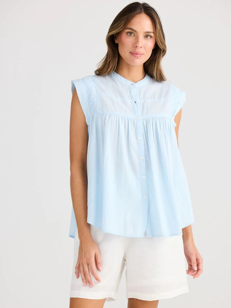 Elevate your wardrobe with the effortless charm of the Clementine Top. Crafted from 100% cotton, it blends breathability with a soft, natural feel ideal for everyday wear or warmer days. The design marries classic structure and feminine detail: a delicate band collar with button-through front, a gathered front & back yoke, and subtle ruched accents that add texture and visual interest. Short sleeves keep it versatile and easy to layer.