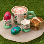 Sip your hot chocolate, tea or coffee in style. With a flower shaped handle and decorated in a sweet bunny and floral themed print, this ceramic mug is sure to delight! A great gift for Easter, special occasions, and ideal for everyday use. It is made from 100% ceramic and is durable and versatile. Holds 350ml. Box Size: 13cm x 10cm x 9cm