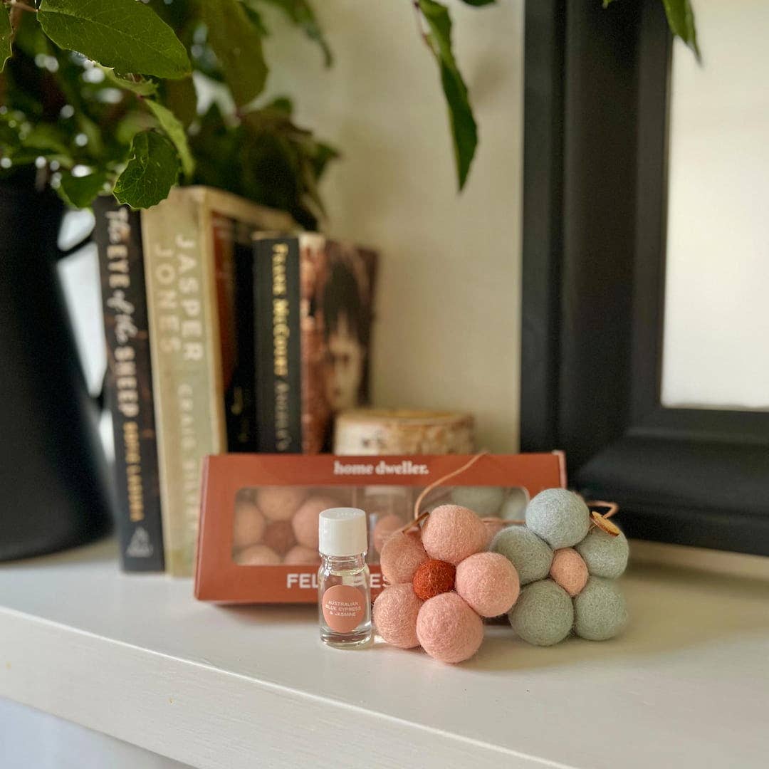 • Includes 2 felt flowers with hanging cord + Blue Cypress & Jasmine Fragrance Oil (Blue Cypress Pine, Patchouli, Sandalwood, Jasmine)