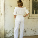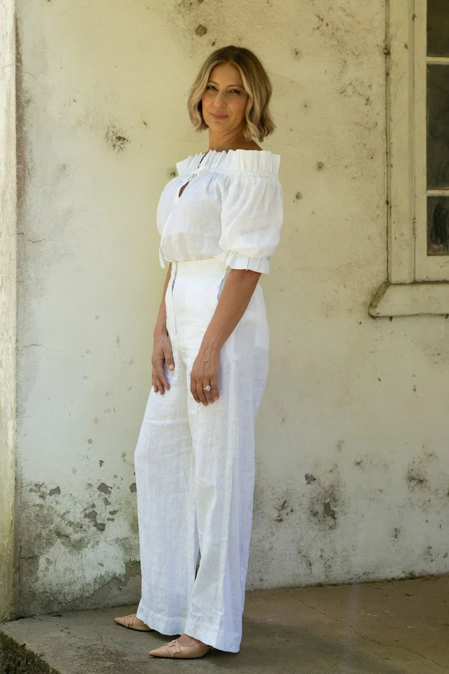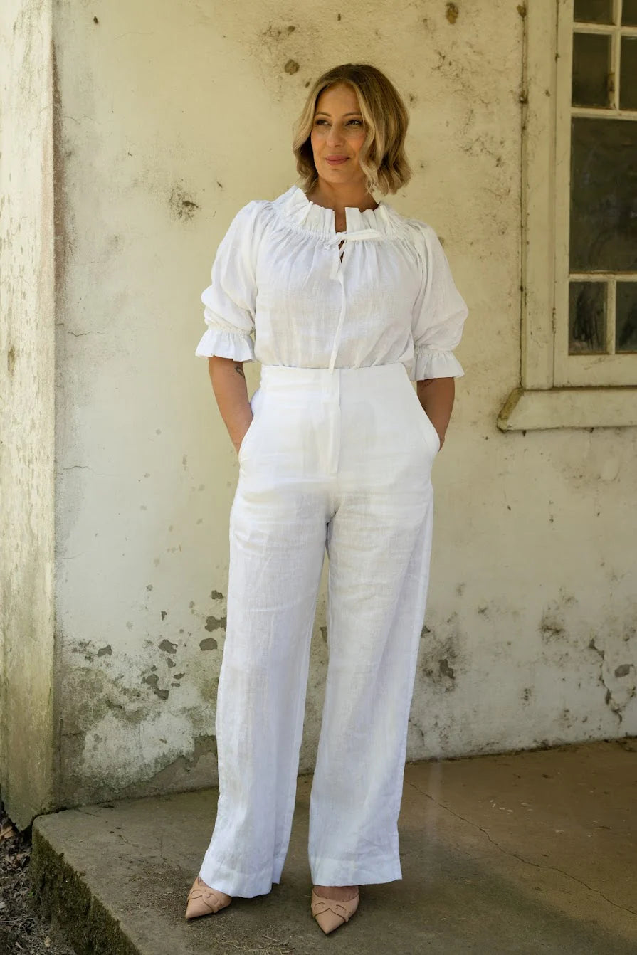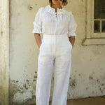 Introducing the Ginny pant. With their elastic back and flat front these pants offer a flattering fit that’s both chic and relaxed. Featuring practical side pockets and an optional linen tie for added flair, they’re perfect for any occasion. Pair them with your favourite DTMH top or shirt to complete your winter look with effortless sophistication.