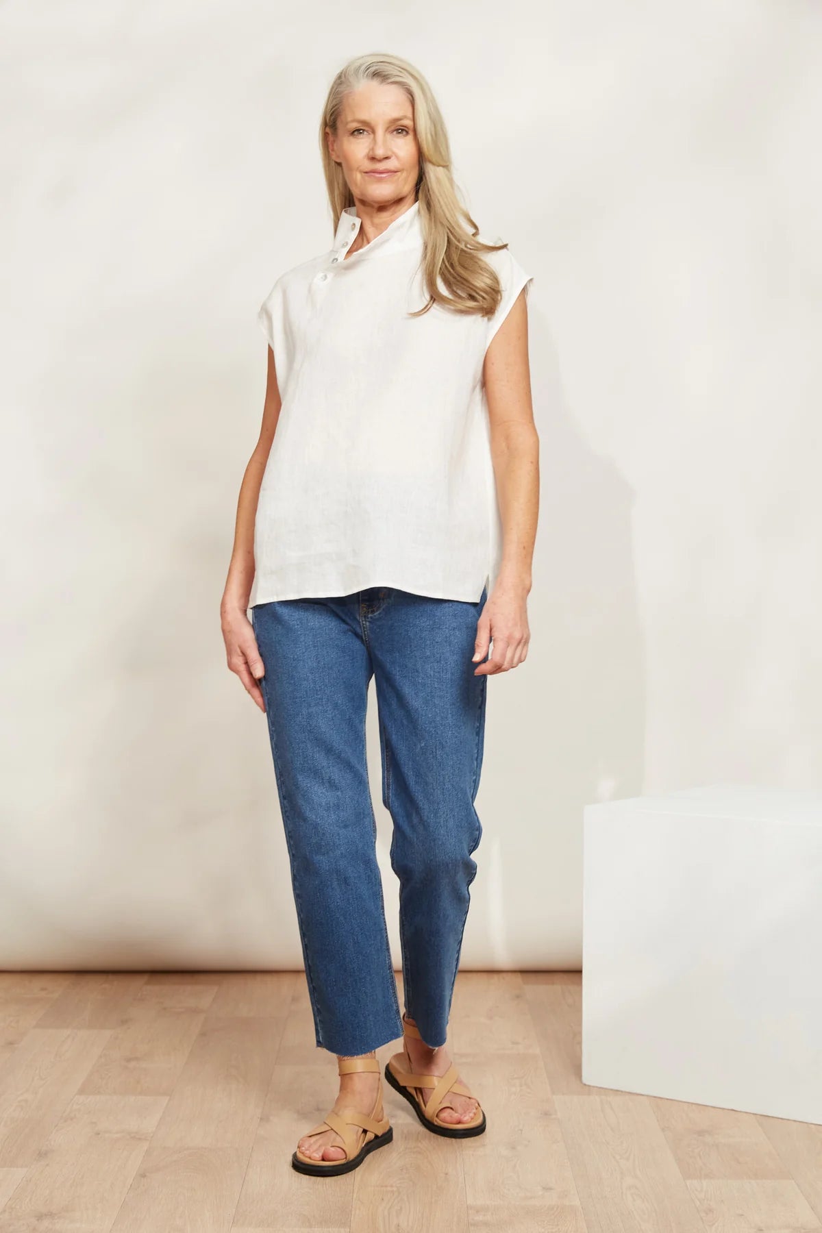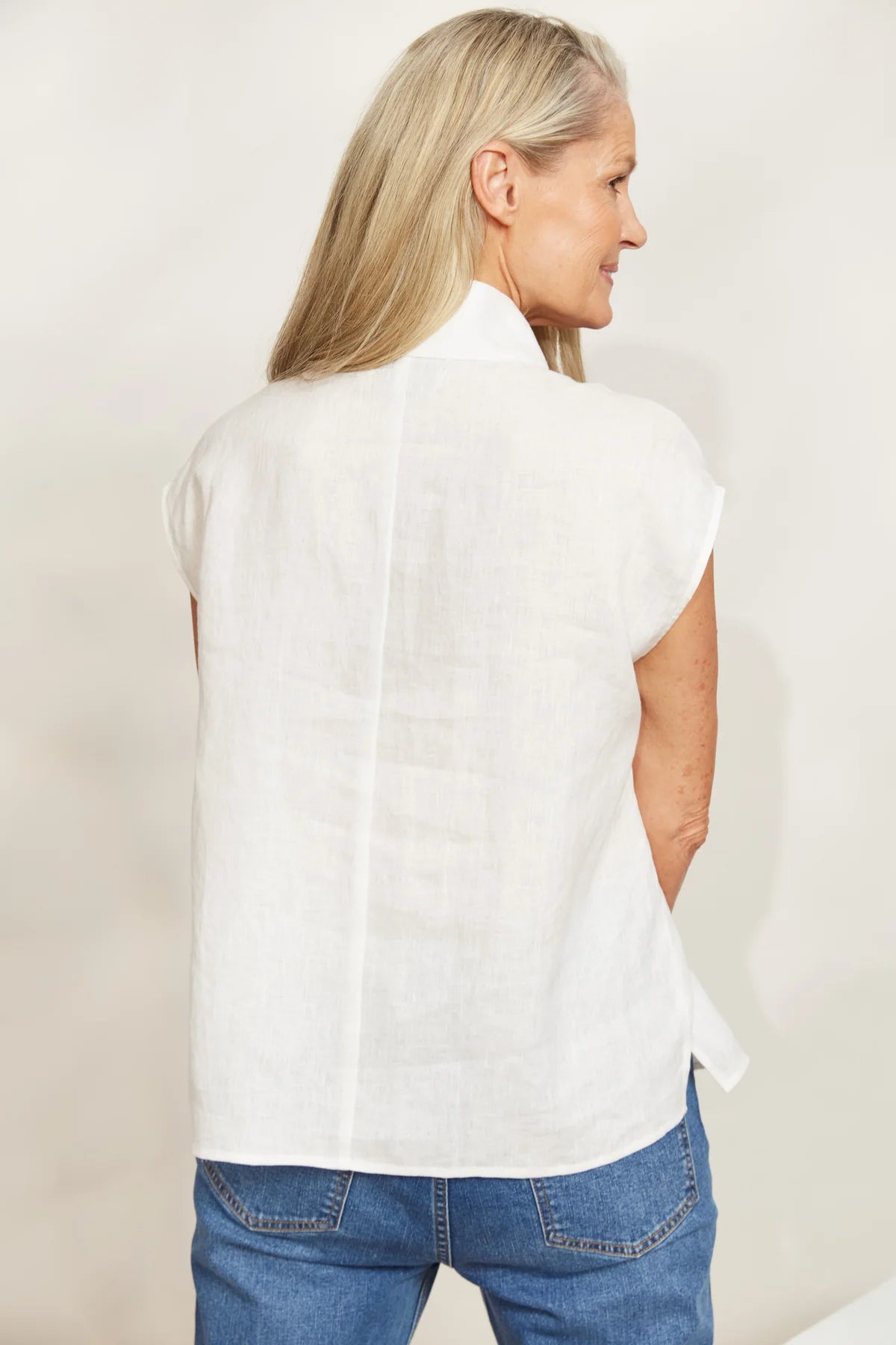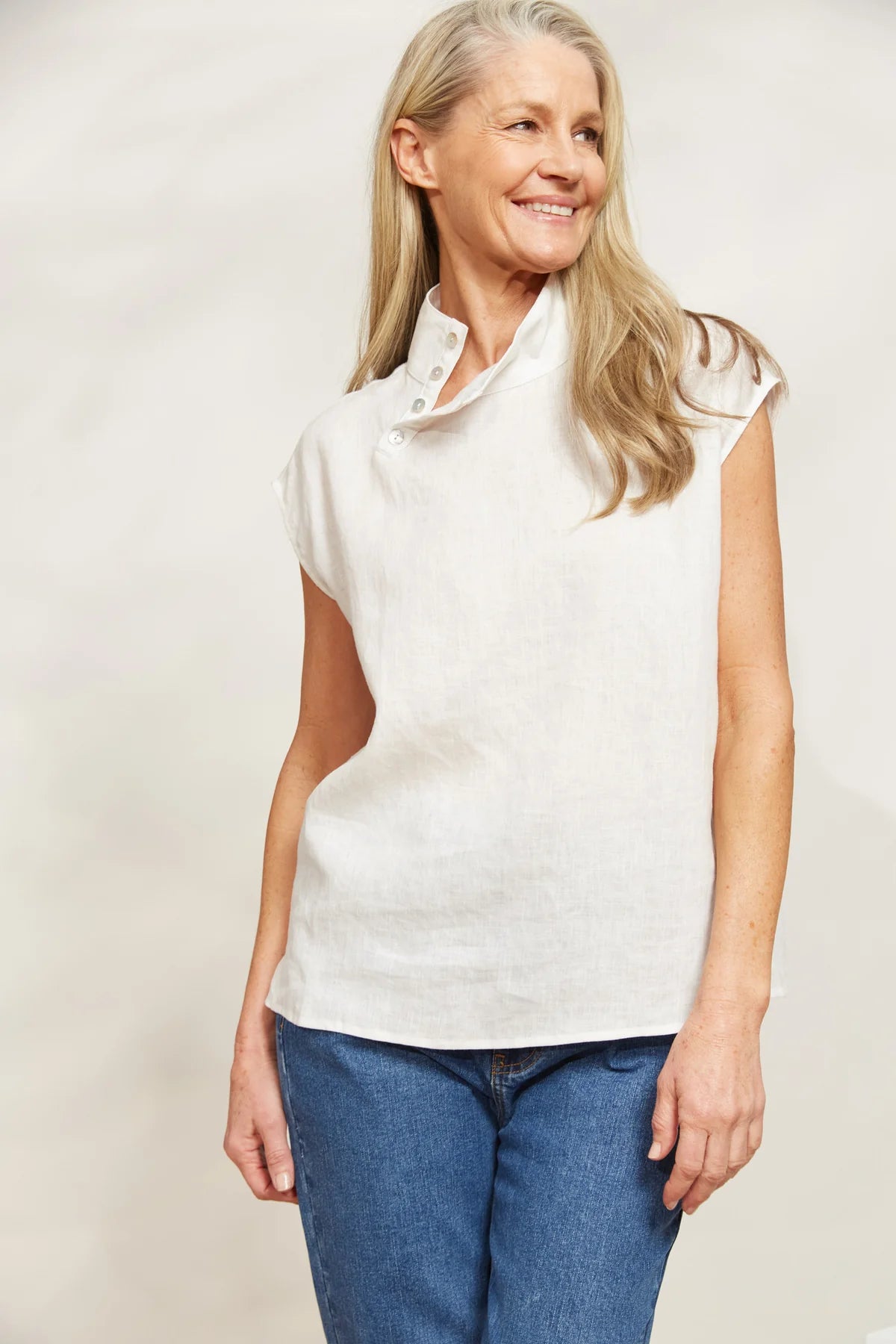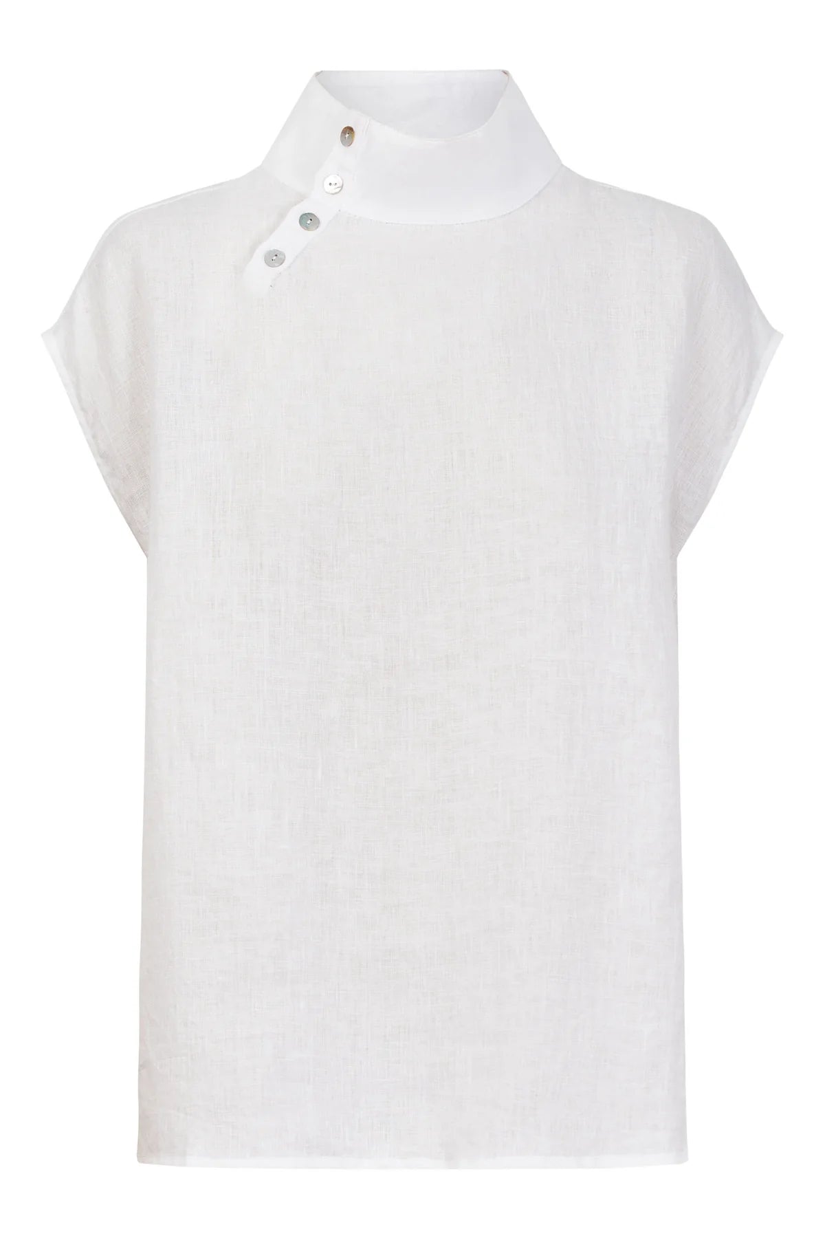 Rich with linen, the Halcyon Button Top epitomizes casual chic. With its sleek high neck detailed with buttons, cap sleeves, and a loose hem, this linen top exudes sophistication wherever you go. From office meetings to dinner dates or leisurely strolls around town, match it with linen pants, jeans or a breezy maxi skirt and strappy sandals.