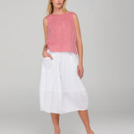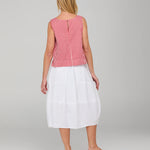 100% cotton, button closure at back, high scoop neckline, side darts on bust, sleeveless, fully lined.