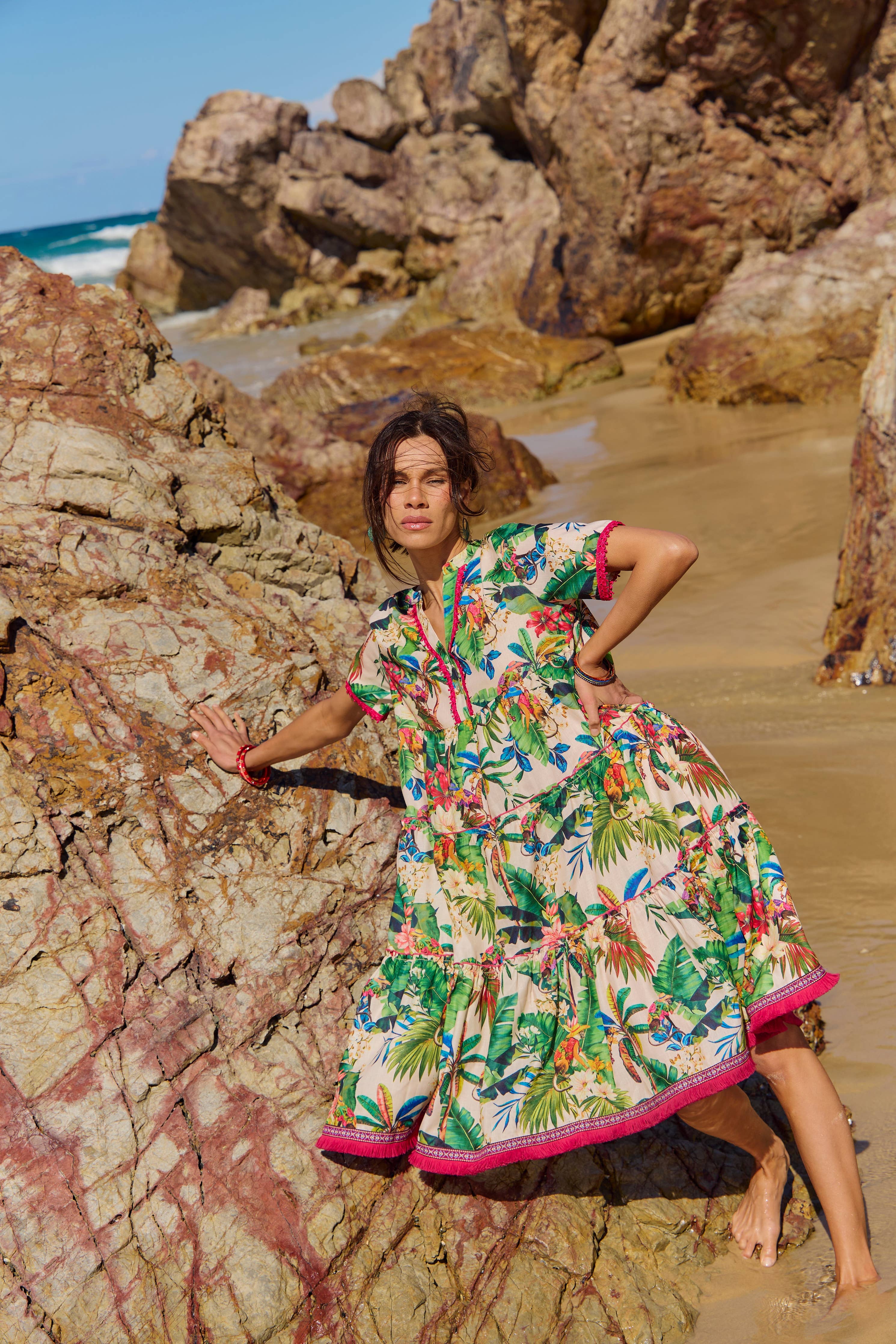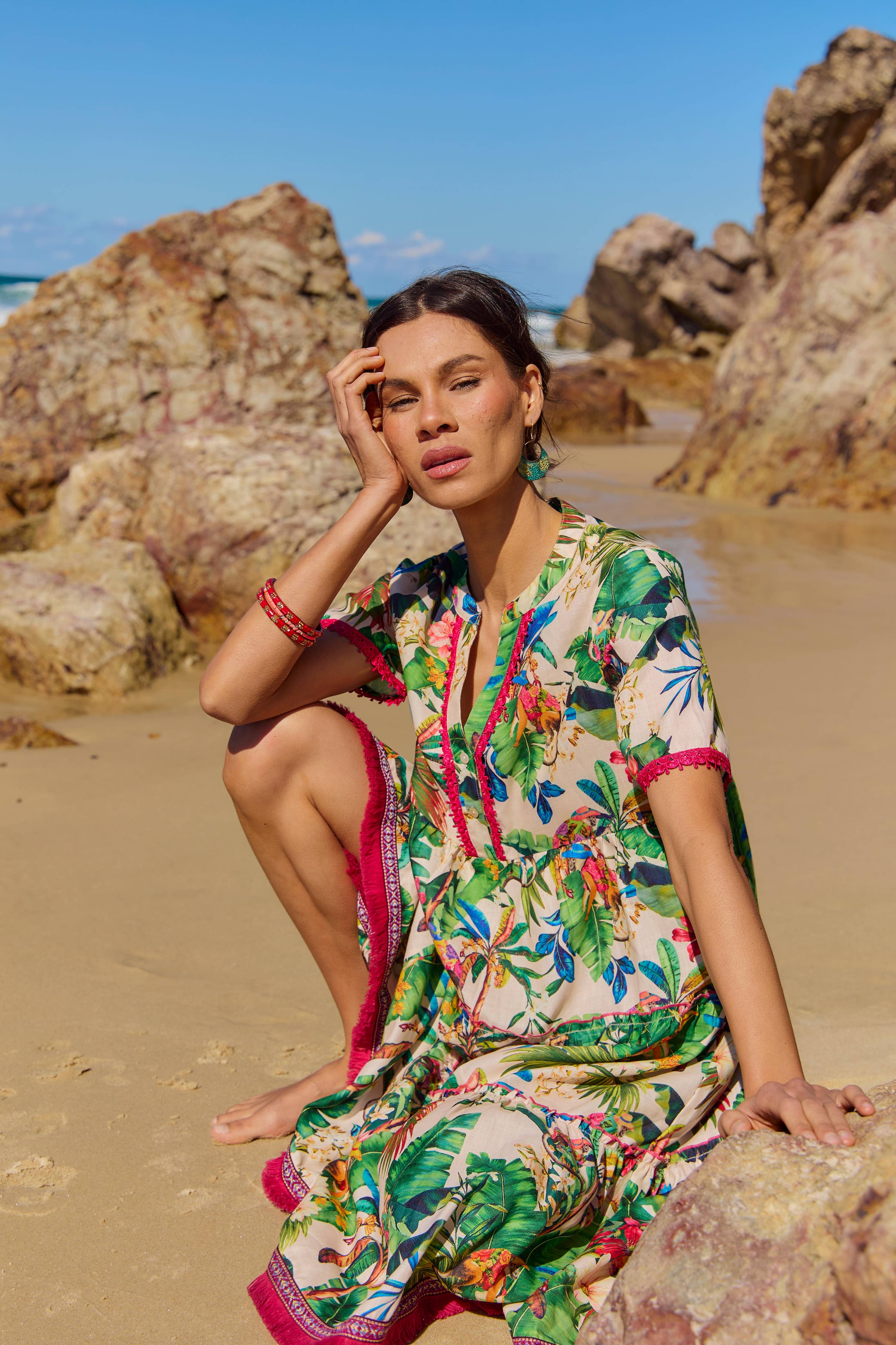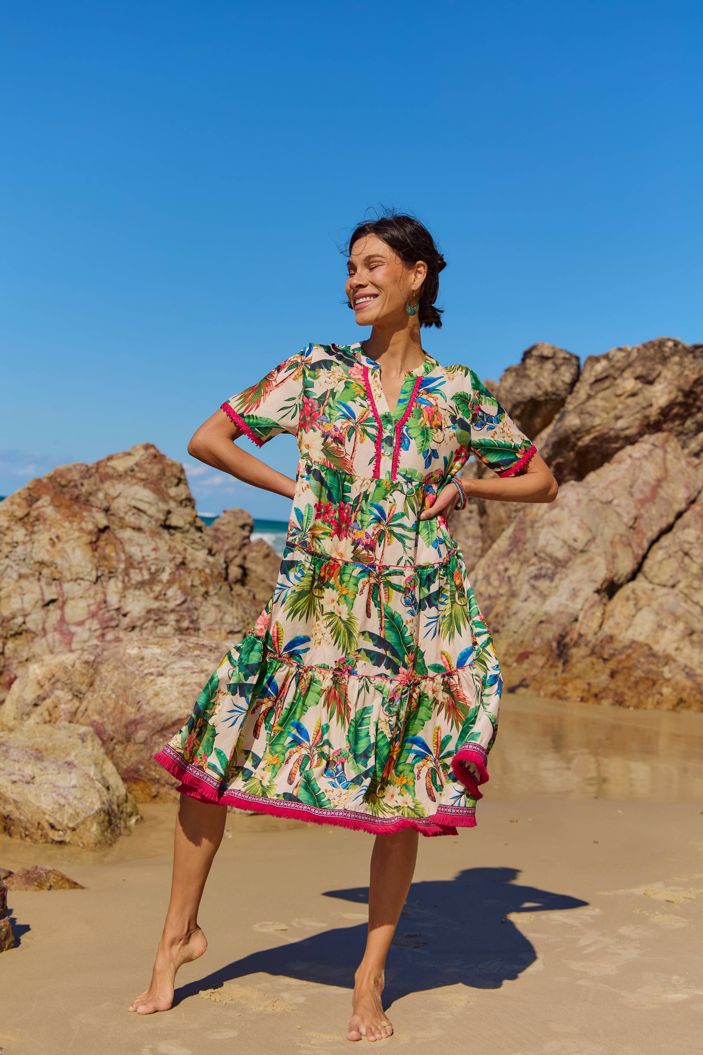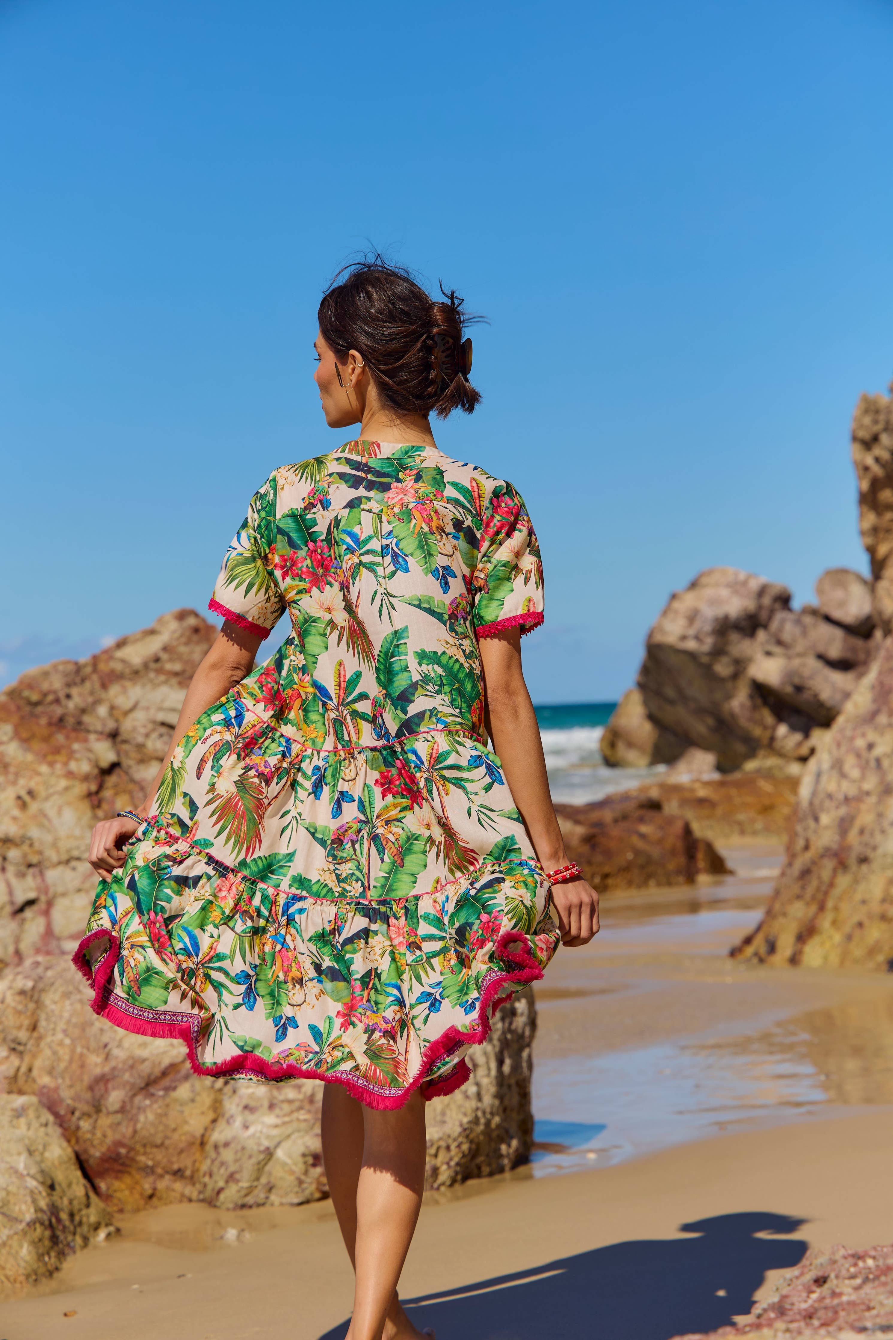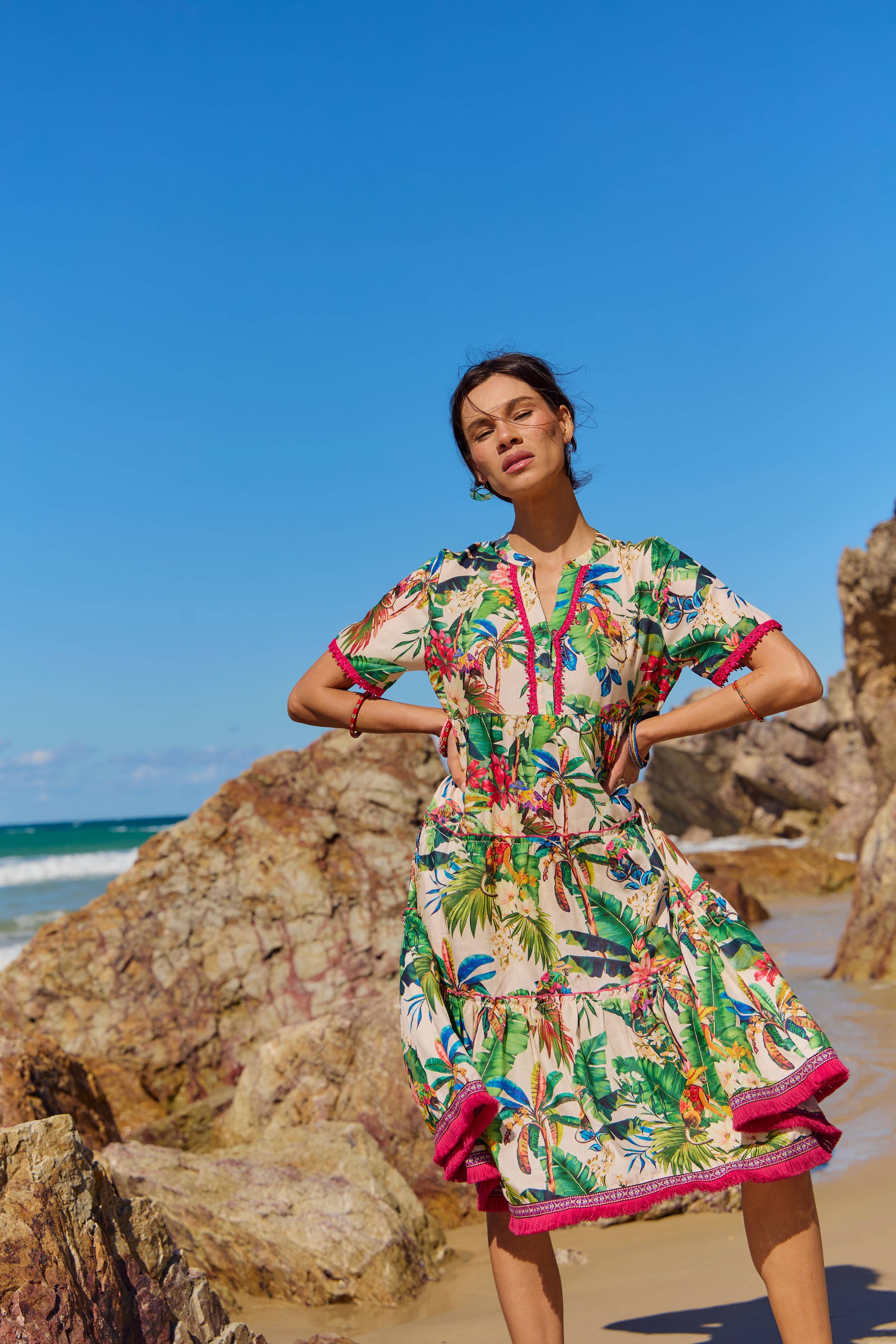Adorned with a vibrant Maui-inspired print, the dress features thoughtful details including trim sleeved detailing and subtle tiering, adding texture, movement, and a feminine, whimsical touch. Perfect for sun-drenched days, casual gatherings, or holiday escapes, the Heather Dress embodies a carefree, yet sophisticated style. Pair it with sandals for a relaxed daytime look or dress it up with accessories for effortless evening elegance.
