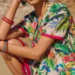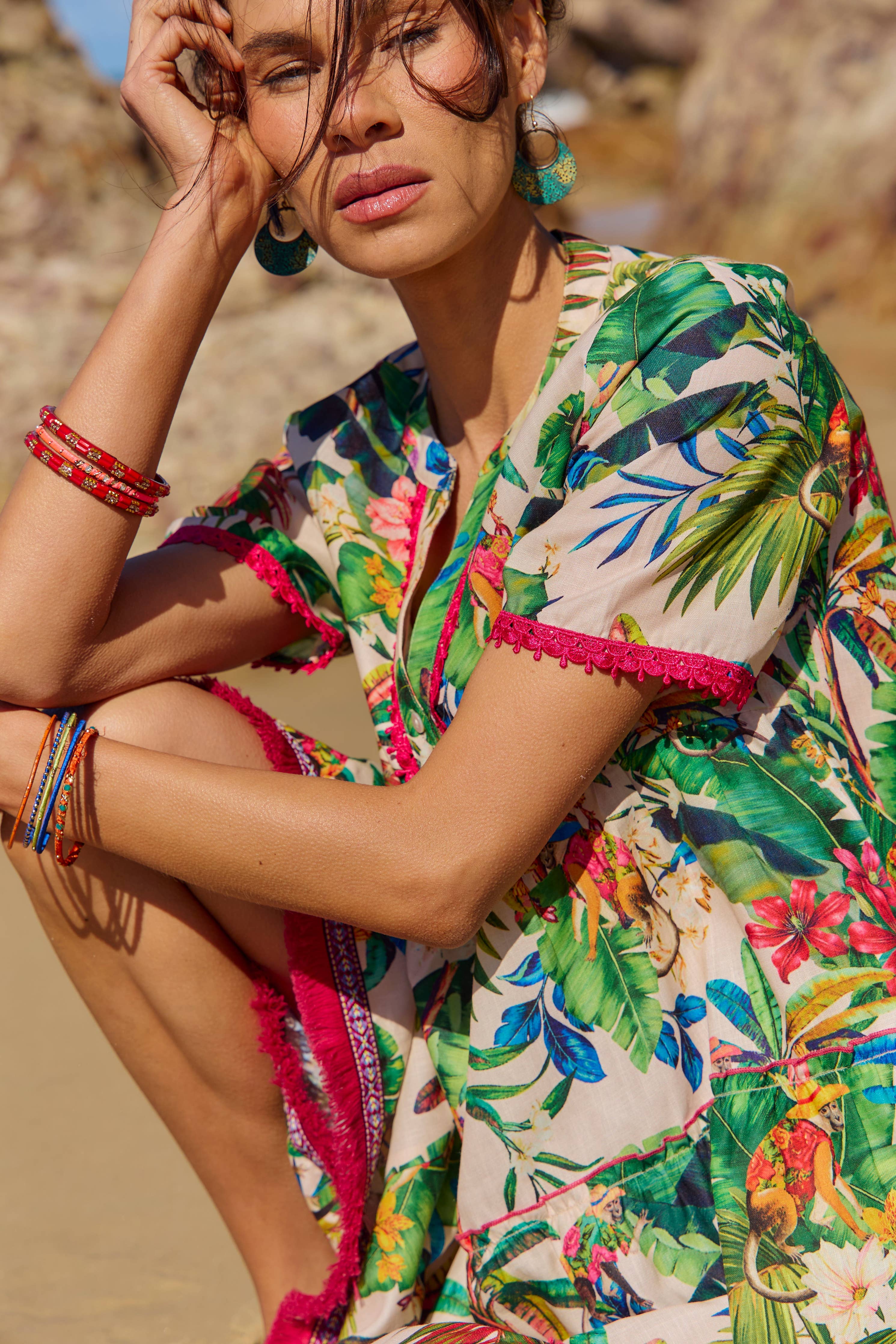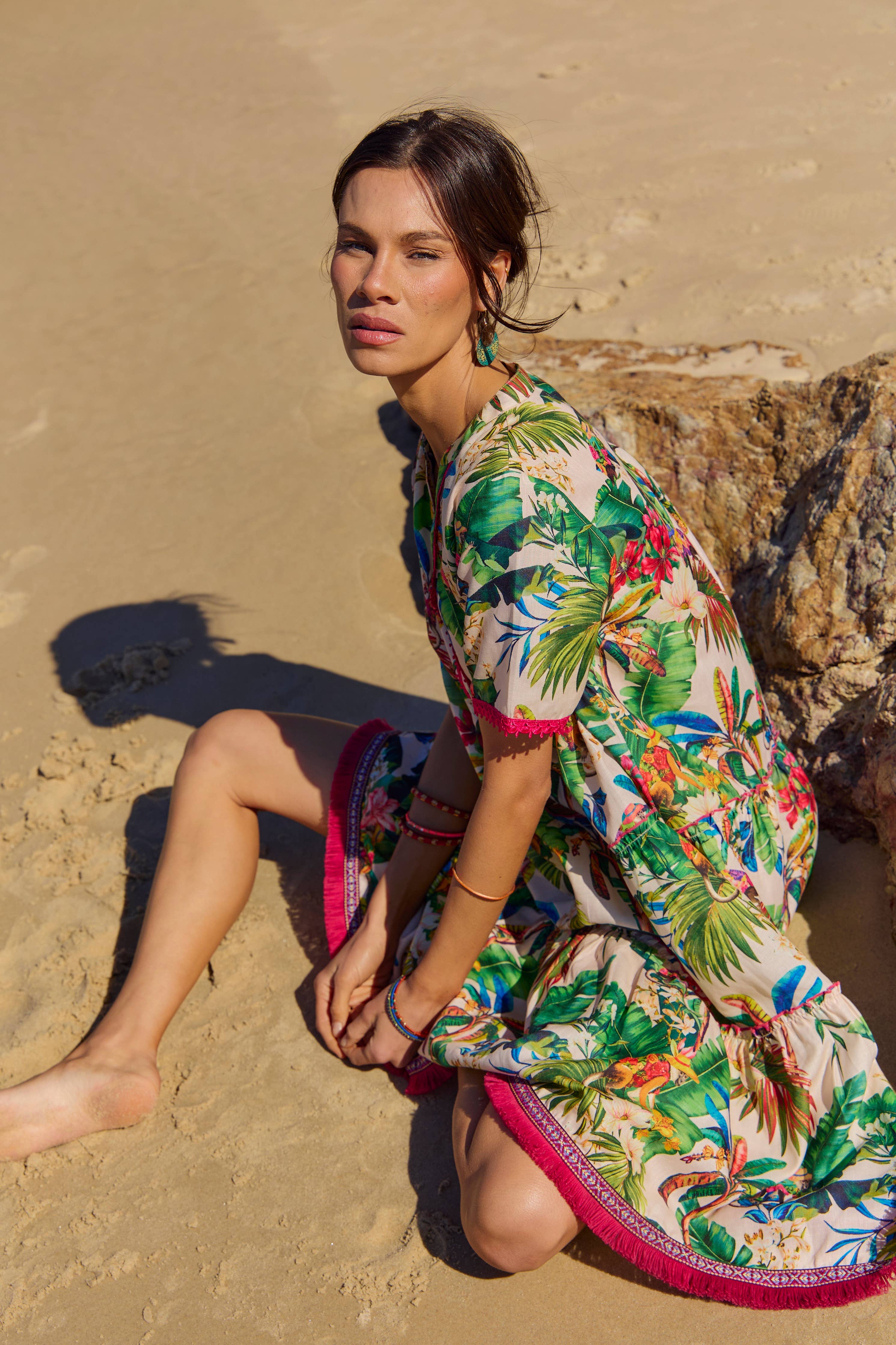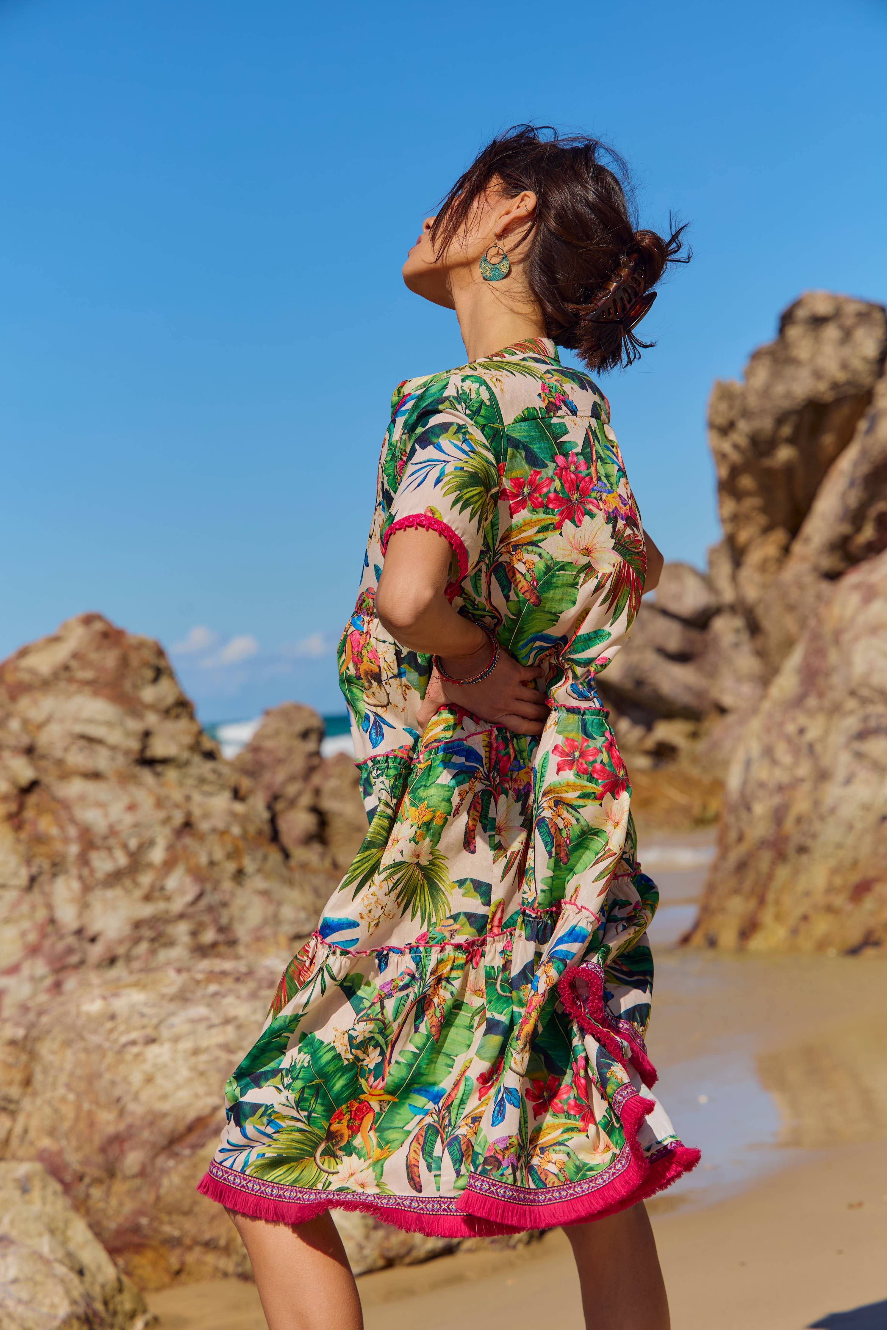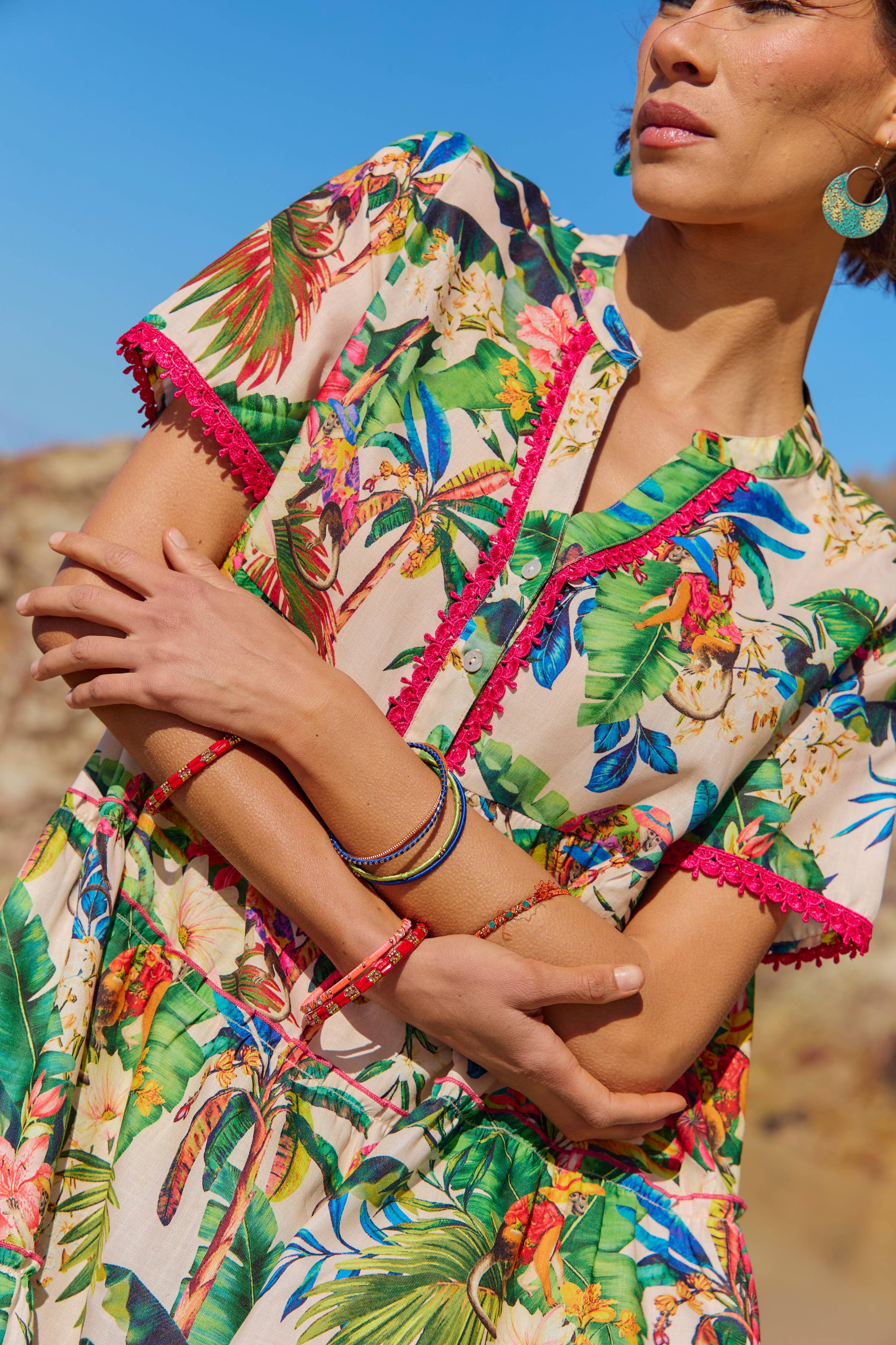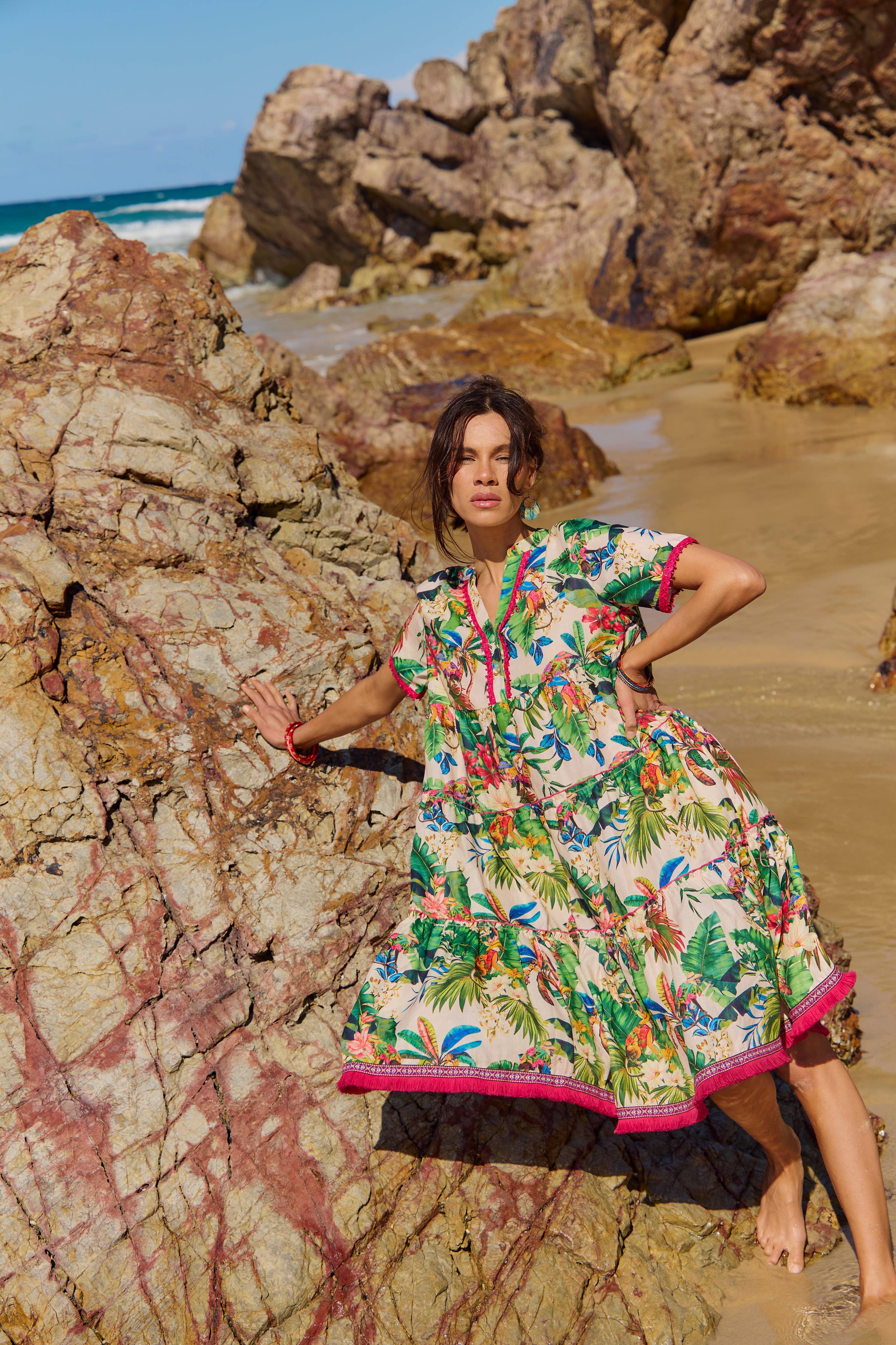 Adorned with a vibrant Maui-inspired print, the dress features thoughtful details including trim sleeved detailing and subtle tiering, adding texture, movement, and a feminine, whimsical touch. Perfect for sun-drenched days, casual gatherings, or holiday escapes, the Heather Dress embodies a carefree, yet sophisticated style. Pair it with sandals for a relaxed daytime look or dress it up with accessories for effortless evening elegance.