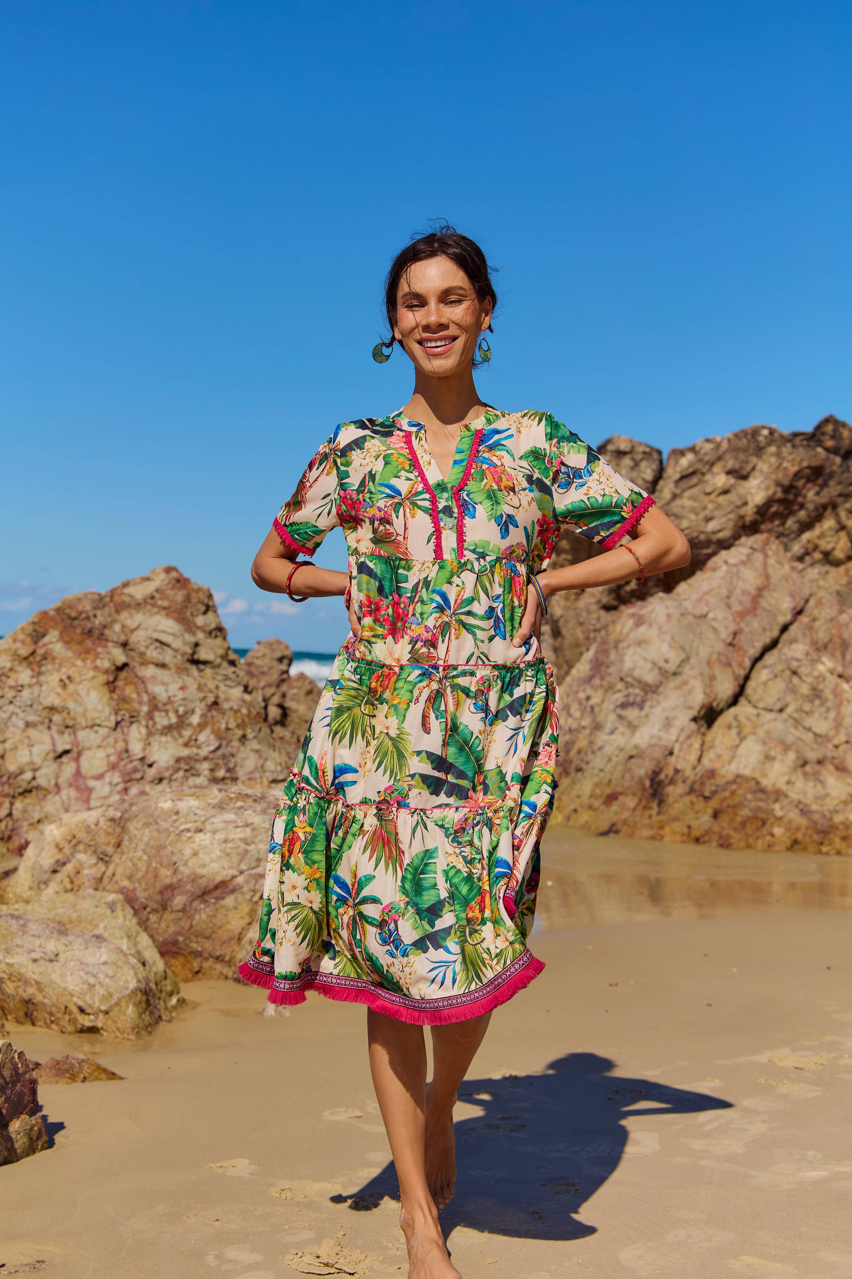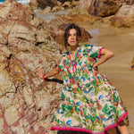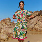 The Heather Dress from Naudic effortlessly combines relaxed elegance with playful tropical charm. Crafted from soft, breathable 100% cotton, it offers a lightweight, comfortable fit while maintaining a flattering, flowing silhouette.