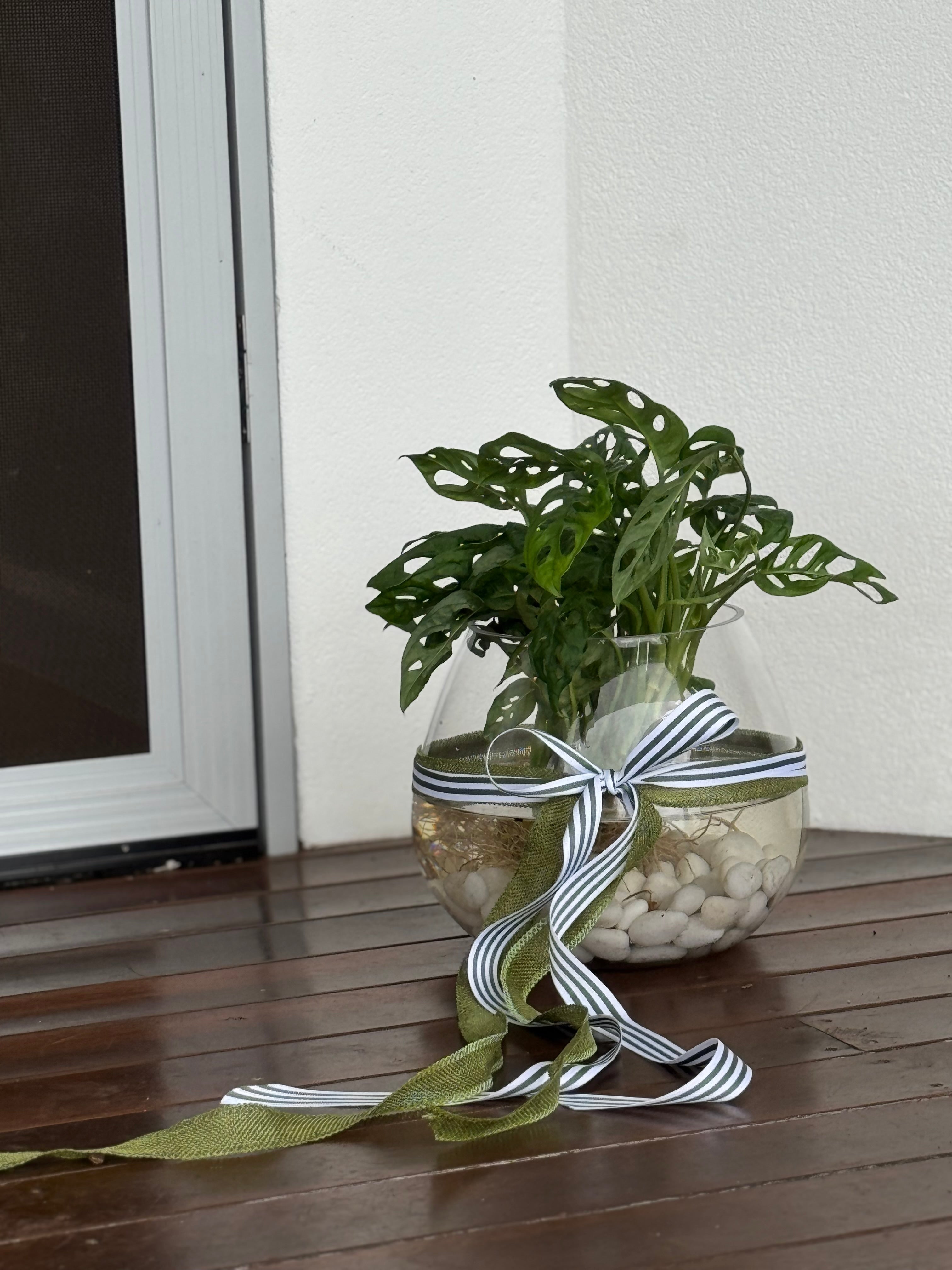Includes: One medium indoor plant in a premium glass bowl, pebbles / rocks complimented with a ribbon and message card