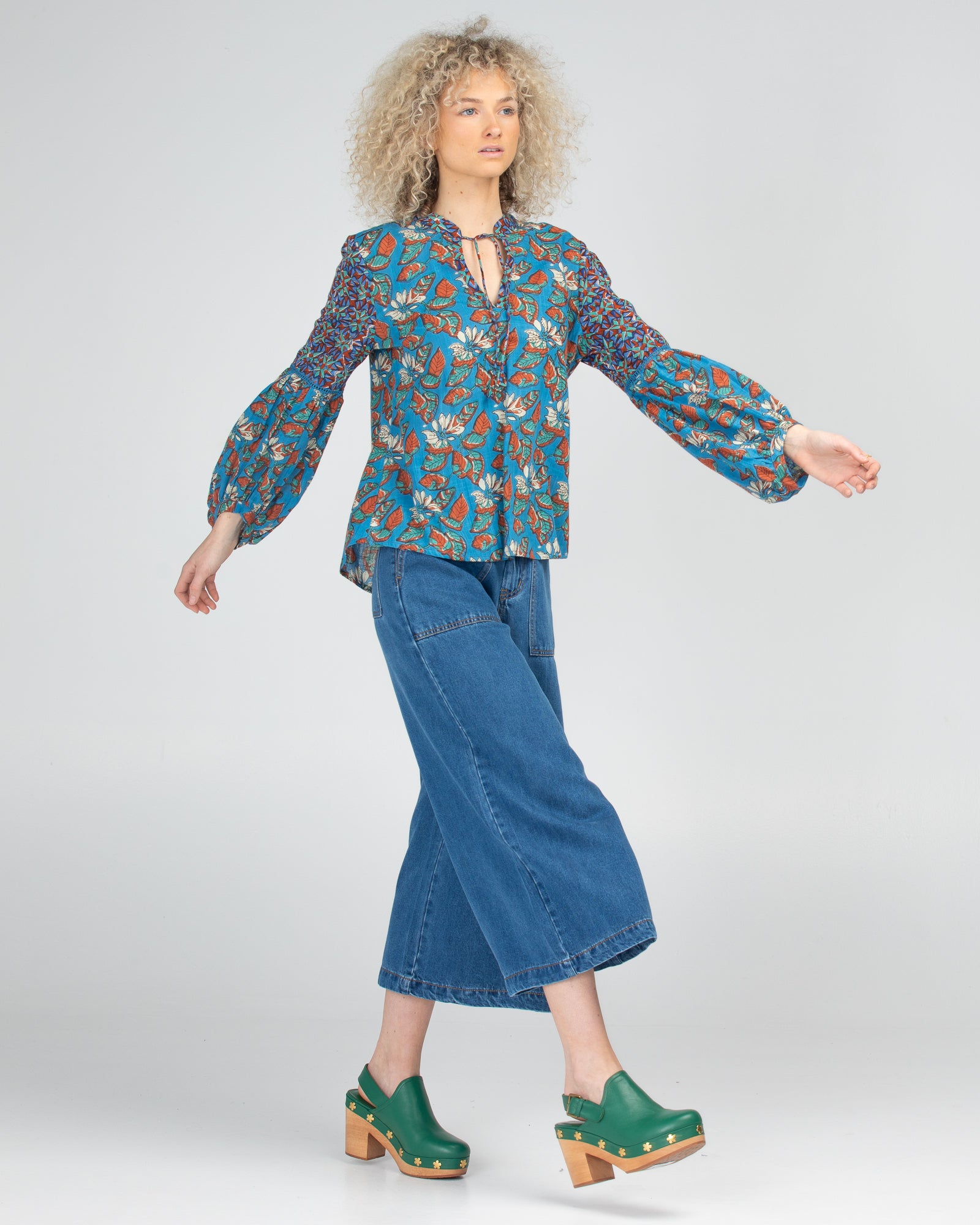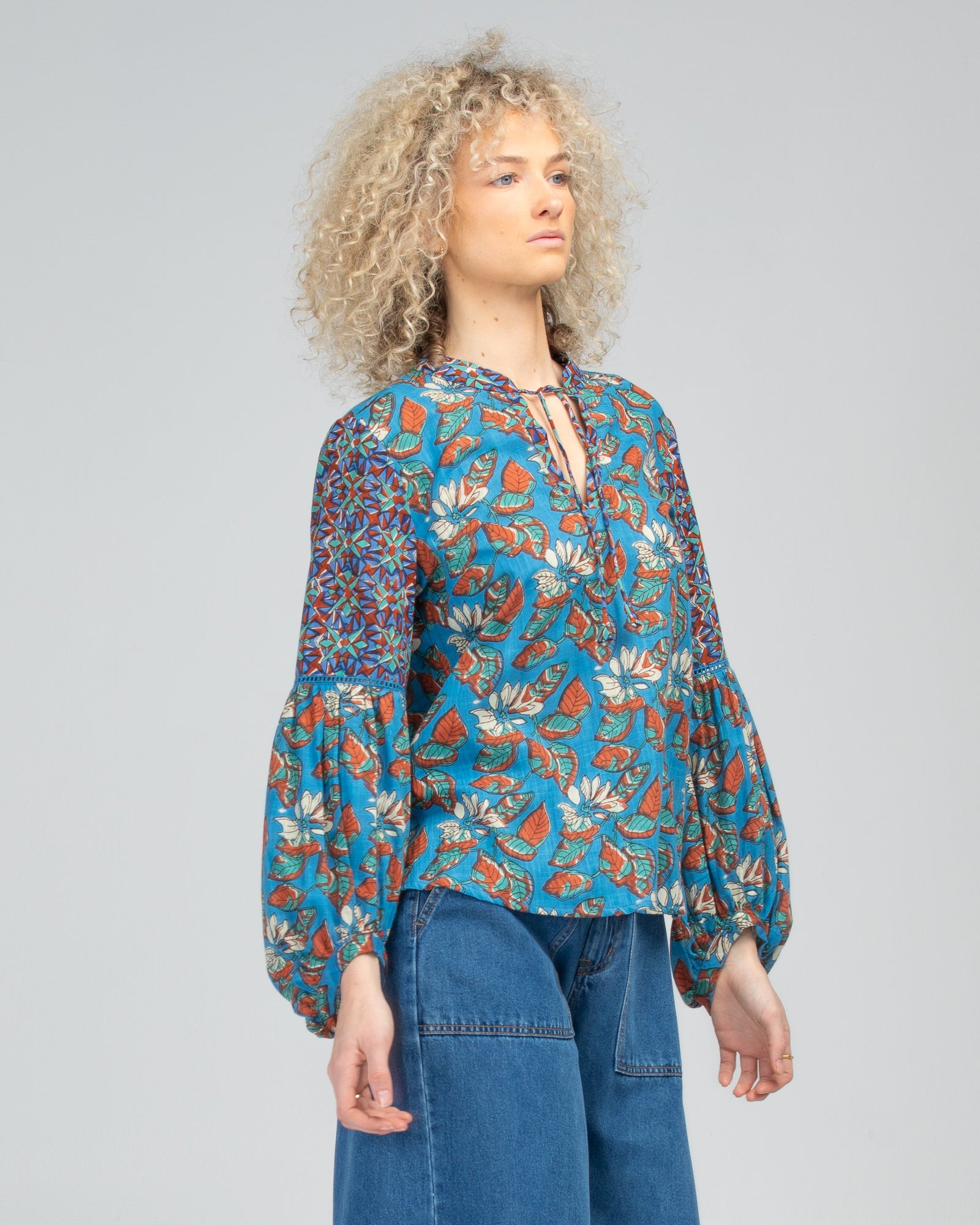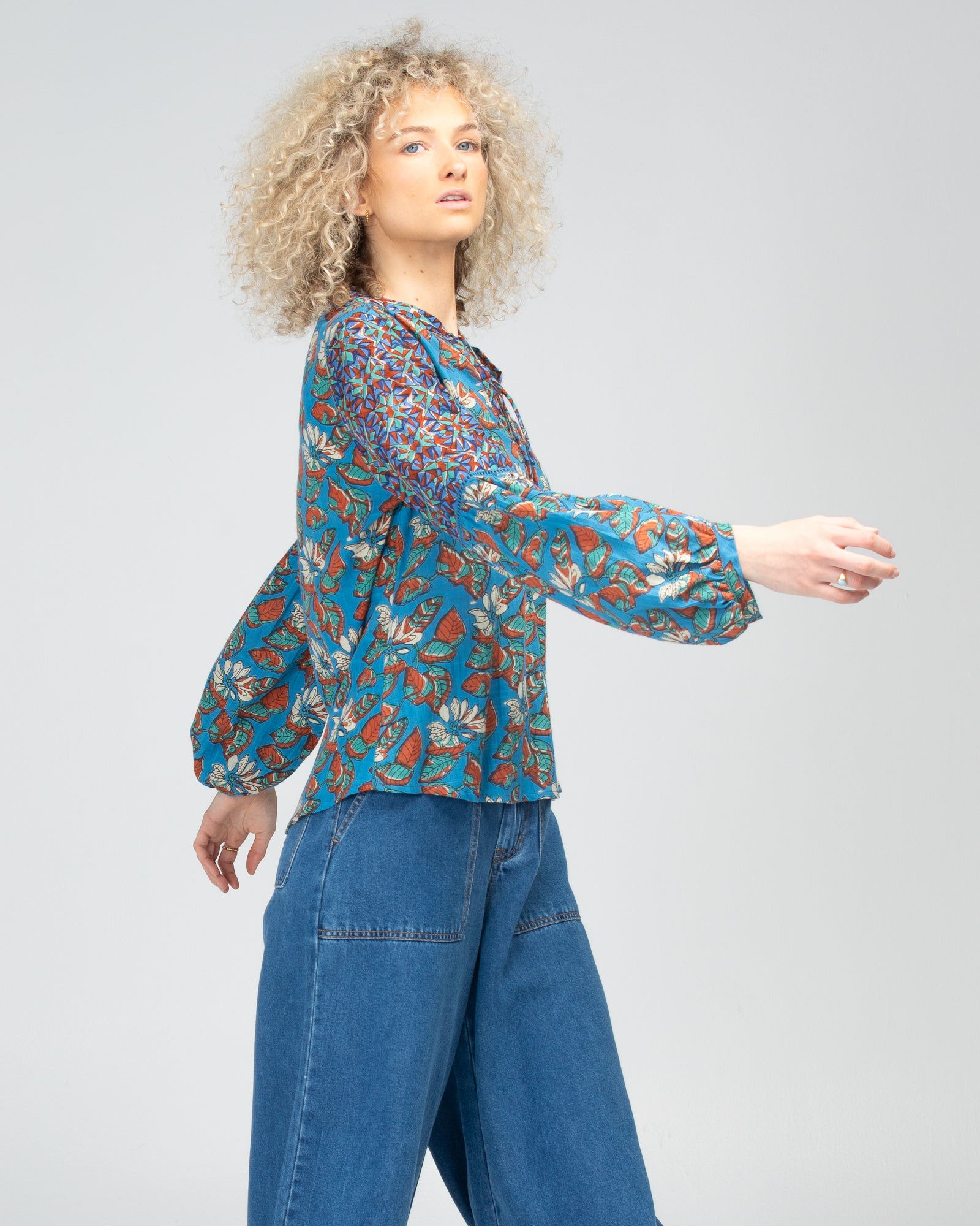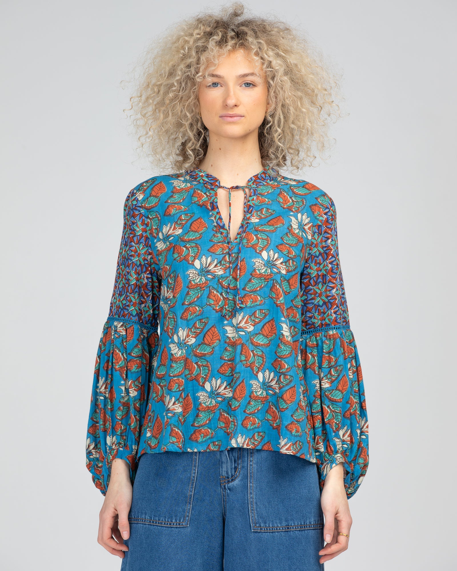 The Splice Lettie Print showcases a striking combination of intricate patterns and bold colours, making this top a standout piece for the season. Designed with a round neckline, soft blouson sleeves, and elasticated cuffs, the Mittee Top offers versatility for both casual and dressy occasions.