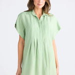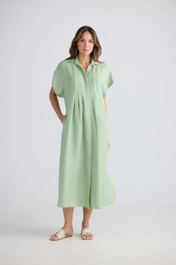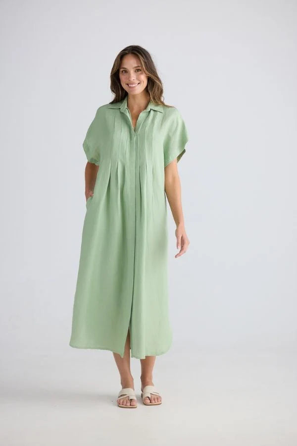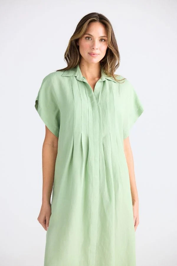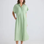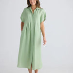 Collared necklineGrown-on short sleeveButton front closurePleated frontCurved hem side splitsMidi lengthRelaxed fit