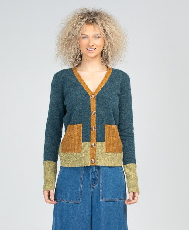 The Boom Shankar Poet Cardigan is a funky, tri-colour twist on your classic cardigan. It features a v-neckline, contrast pockets and a button front opening.