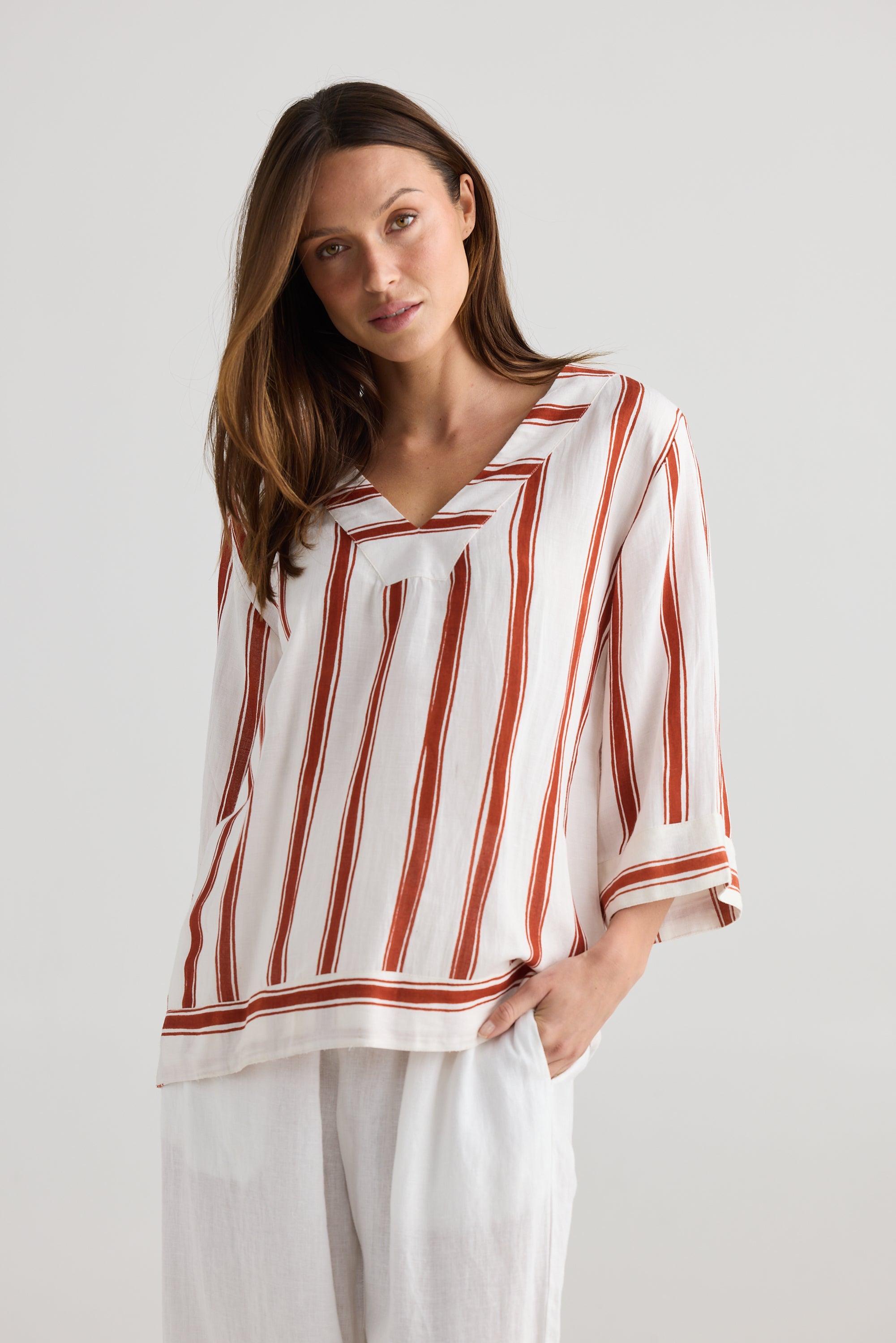 Elevate your wardrobe with the Ray Top in Drifter Stripe, a relaxed yet refined staple designed for effortless style. Made from a breathable viscose-linen blend, this lightweight top offers a soft, airy feel with a structured drape—perfect for Tran seasonal dressing.
