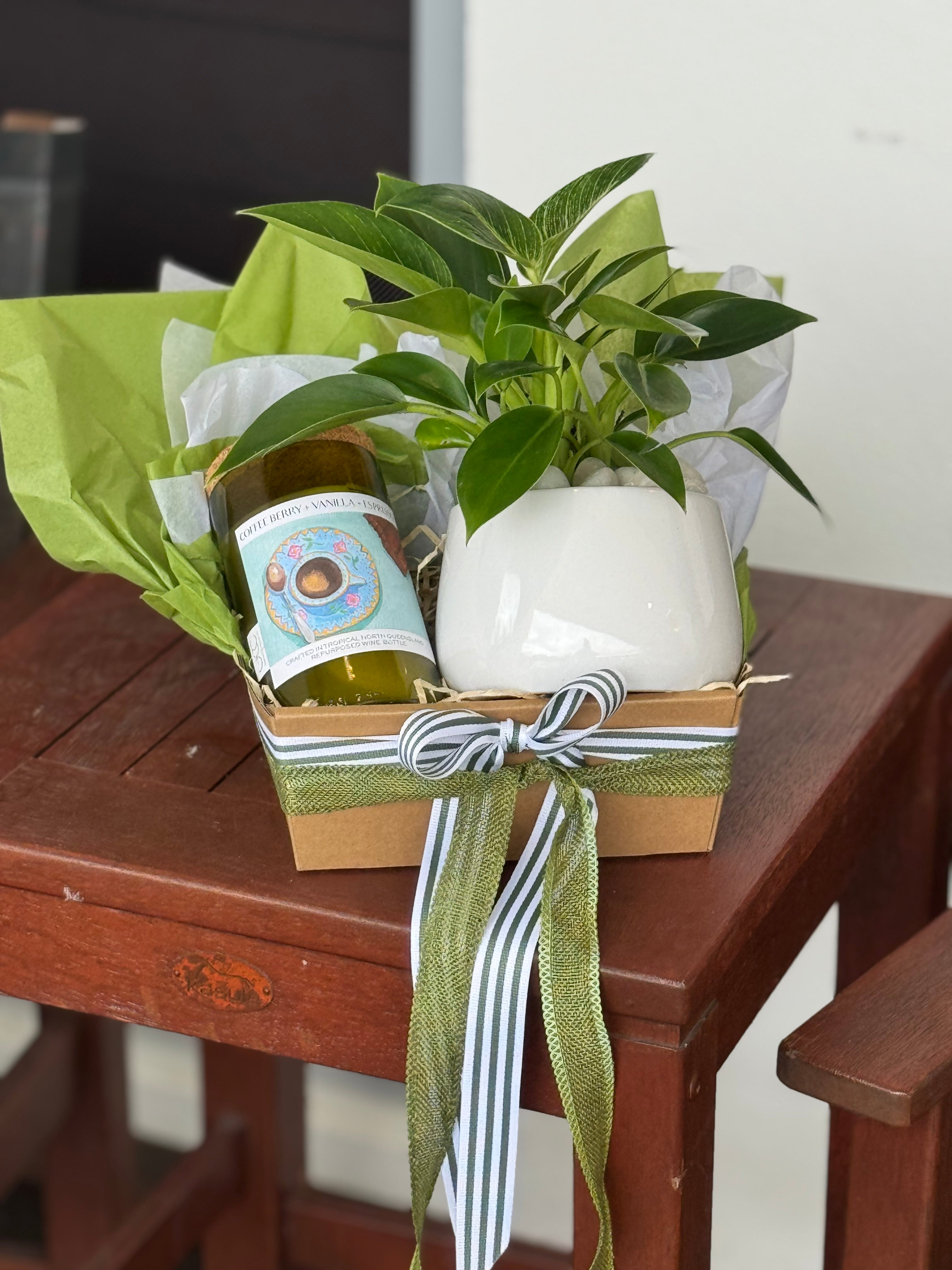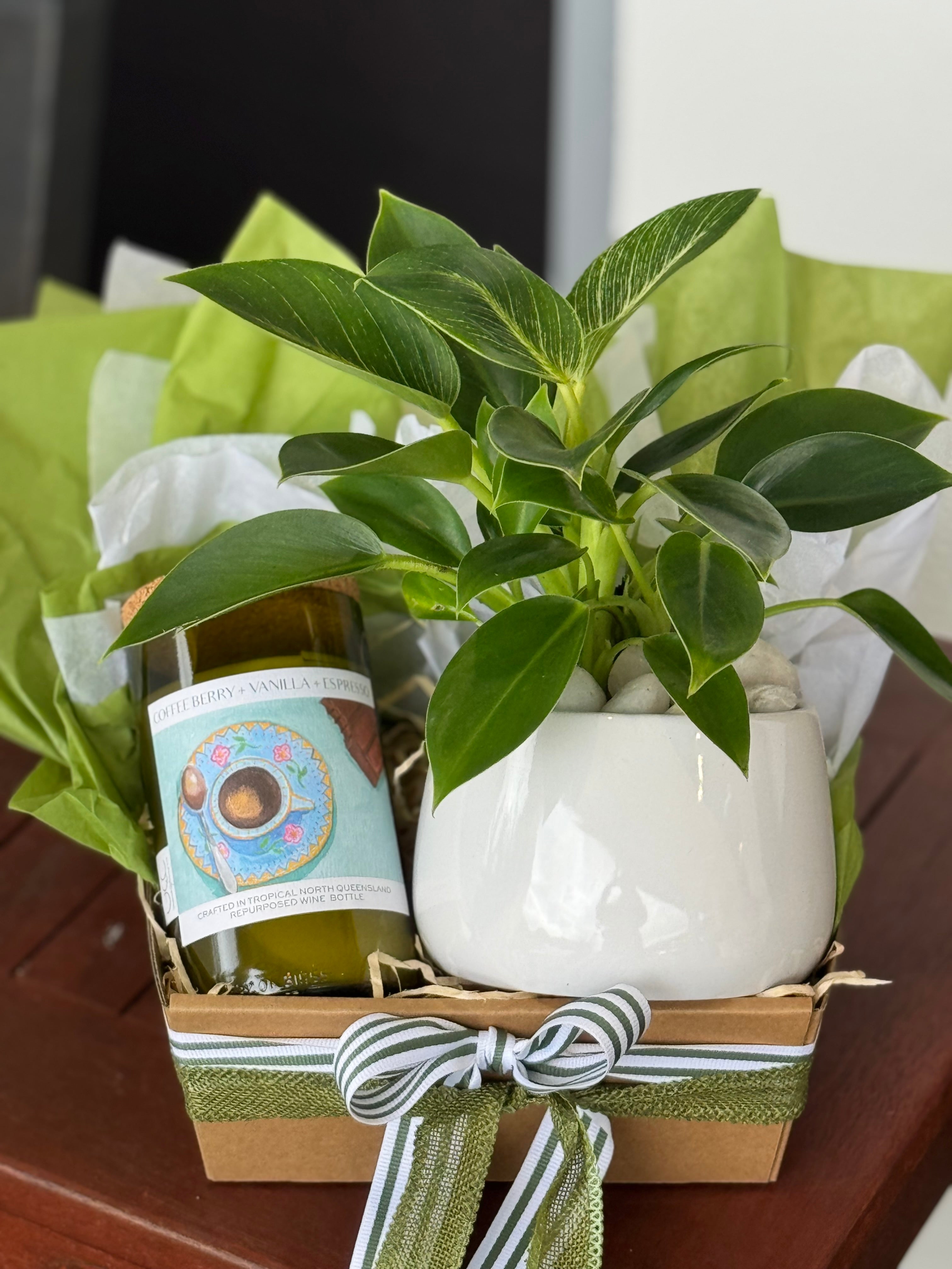 Nurture the senses with our Scent & Grow Hamper—a soothing combination of greenery and scent. This gift includes a hand-picked indoor plant in a ceramic pot, topped with decorative stones, and a premium Unwined Candle, hand-poured in Australia using repurposed wine bottles. Each candle is vegan-friendly, made with natural soy wax, and boasts a rich, lasting fragrance.