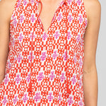 100% cotton, V neckline with tie, sleeveless with binding detail on armholes, a-line hem and shoulder gathers.
