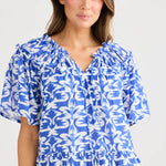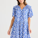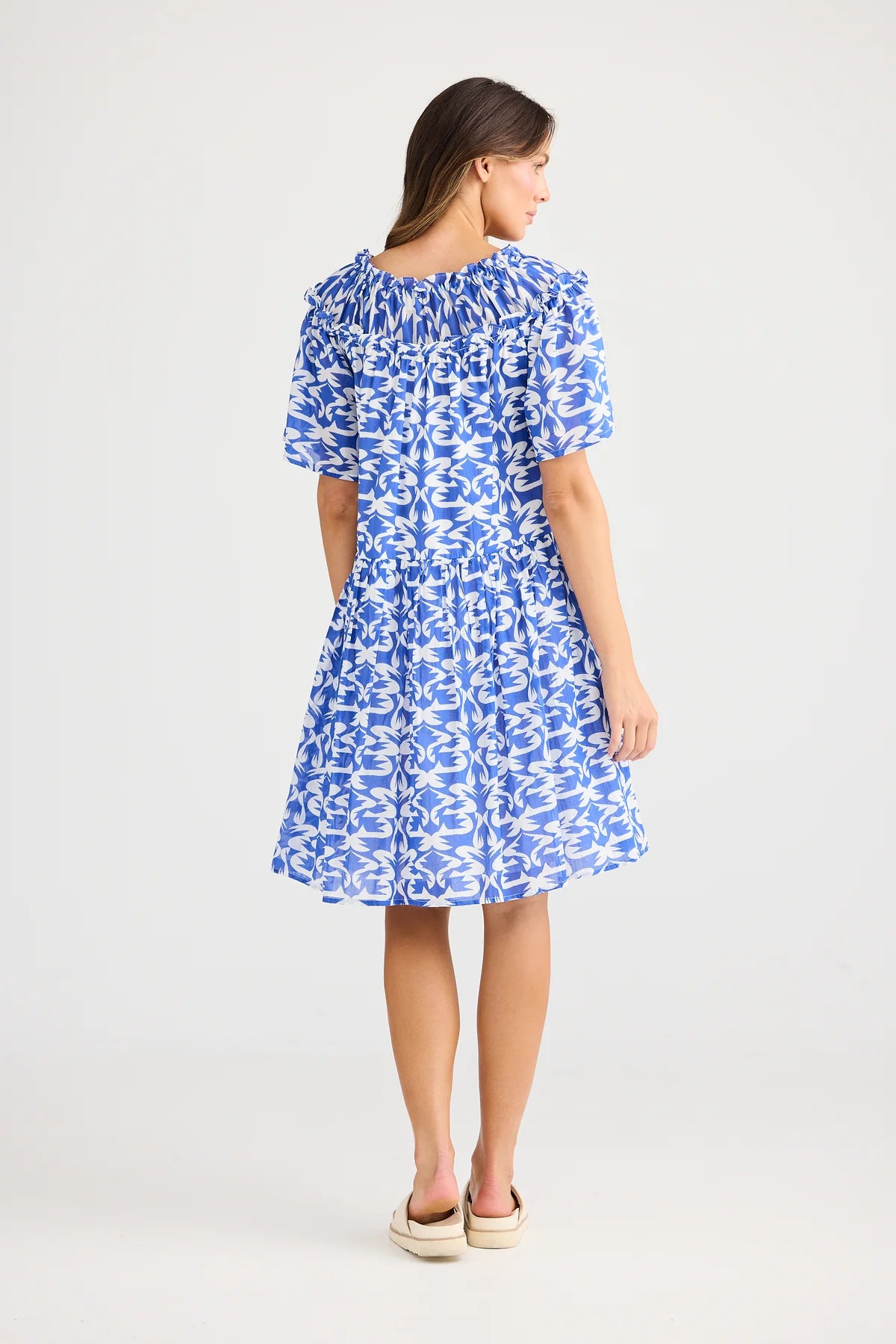 The Soliel Mini Dress in tile print features a ruffled neckline with a tie closure and short ruffle sleeves. It includes a gathered skirt and falls to a mini length for a stylish, feminine look.