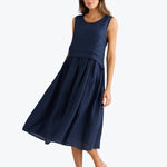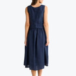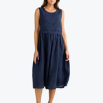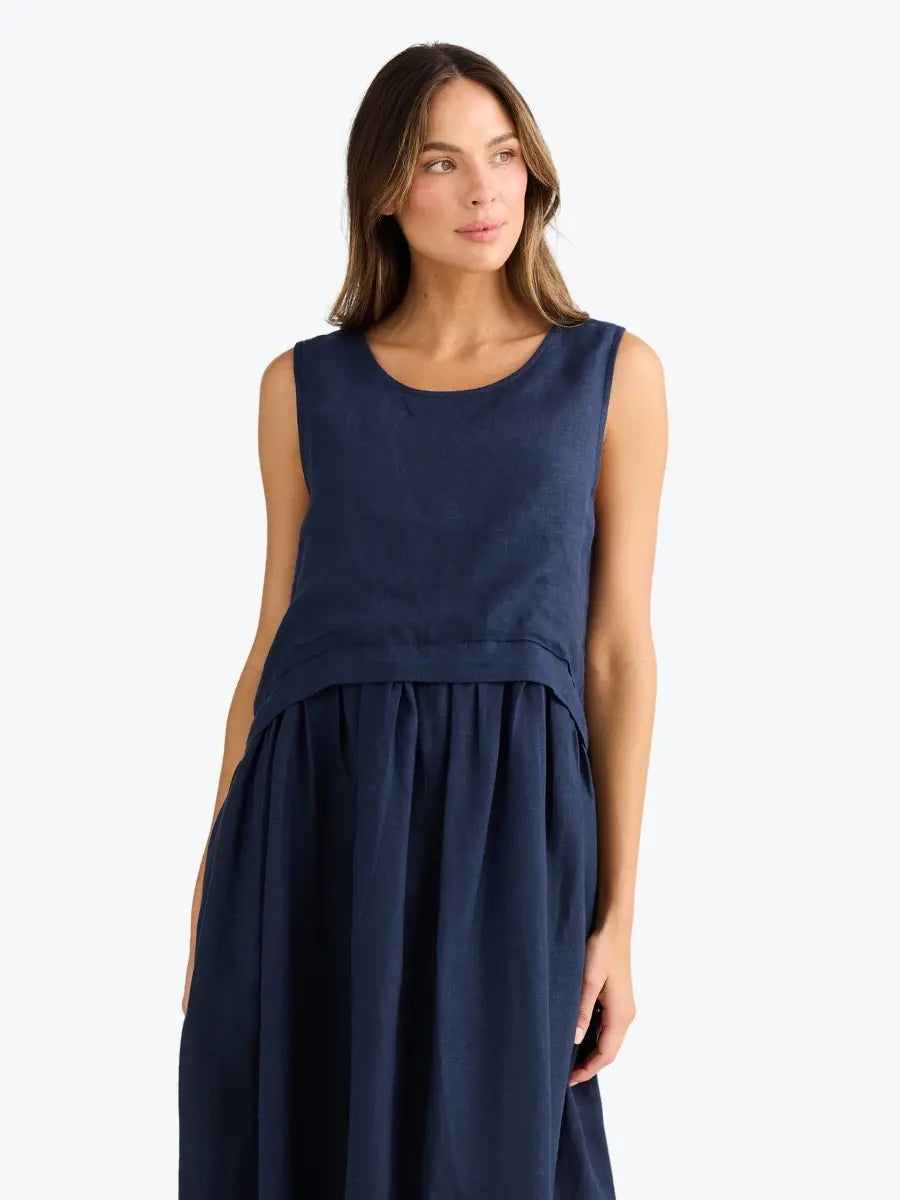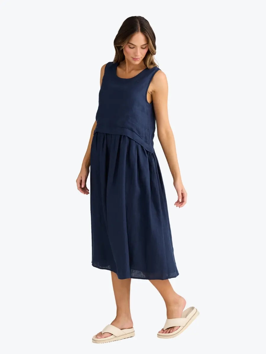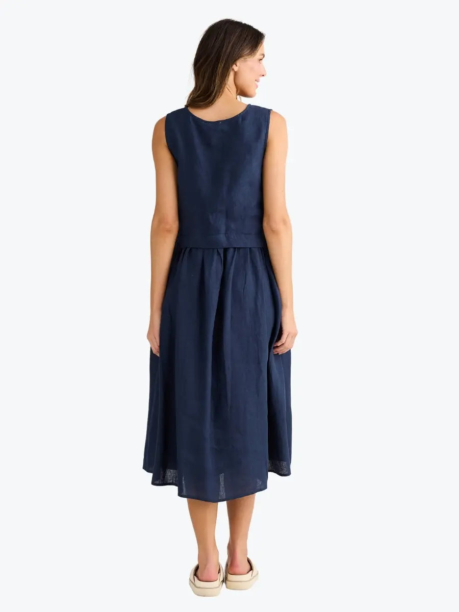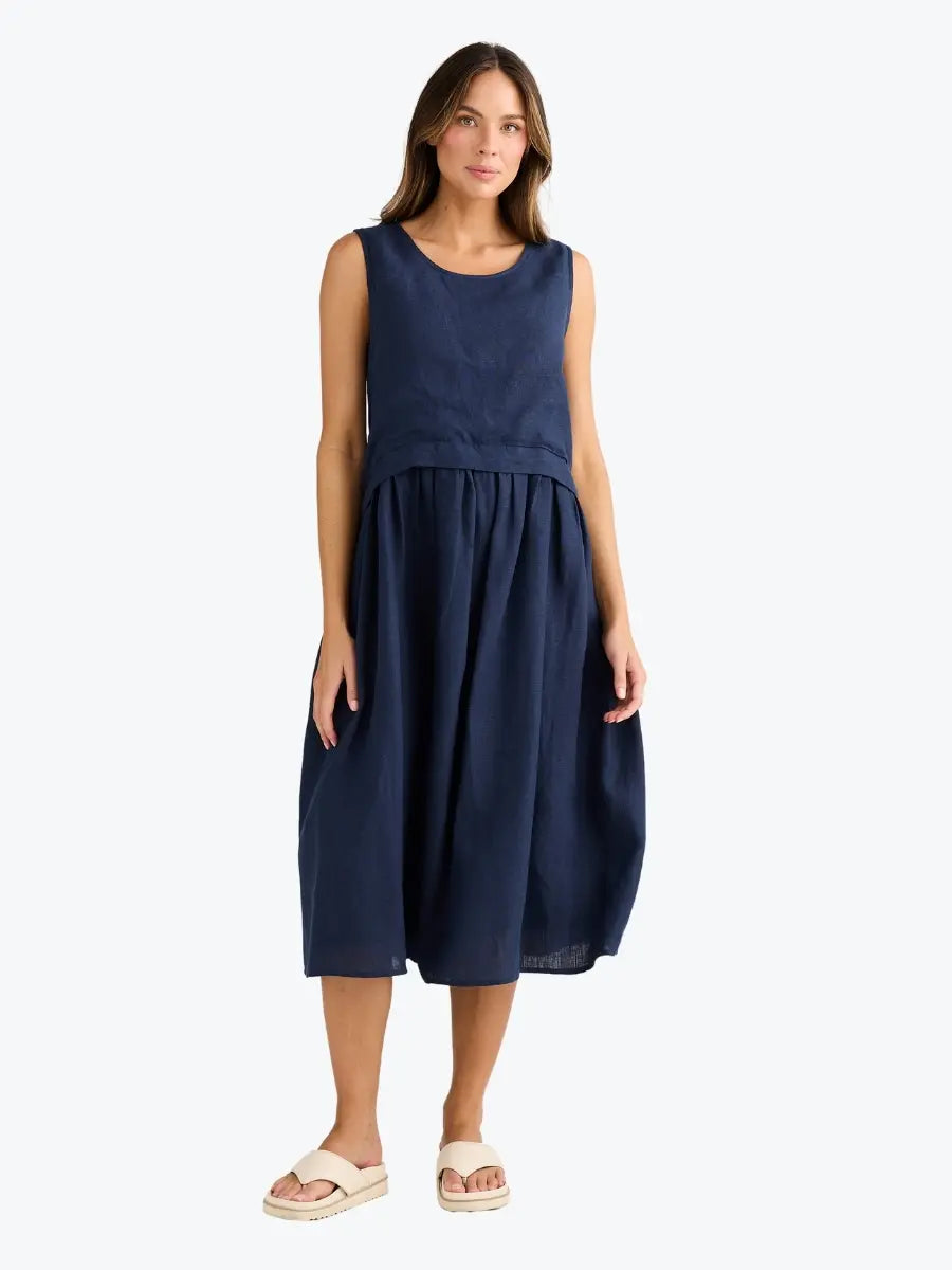 The St Tropez Dress from Holiday is back!. With a round neckline and curved waistline hem, this dress boasts a loose and flowing fit that exudes sophistication. The gathered skirt adds an elegant touch while the midi length adds a touch of luxury. This versatile piece can be dressed up with jewellery and heels or down with sandals or runners for a more casual look.