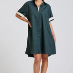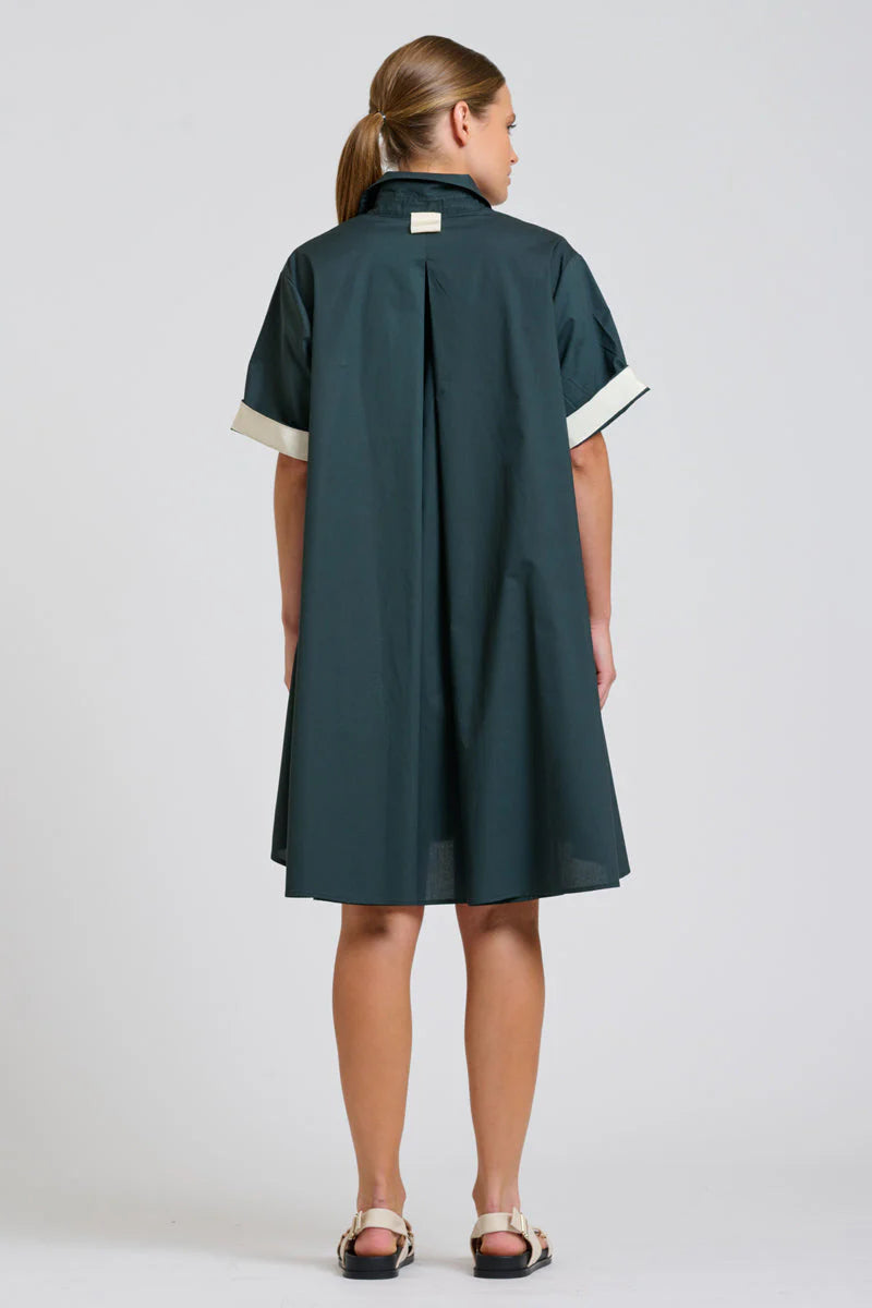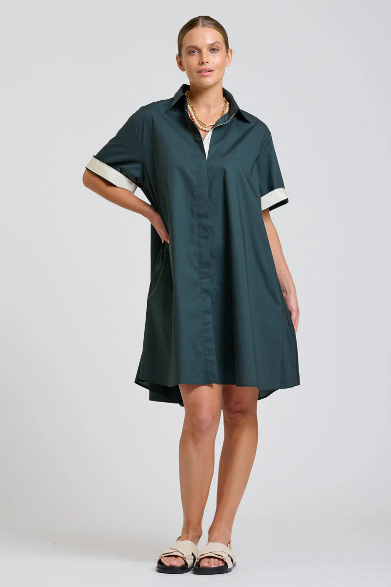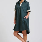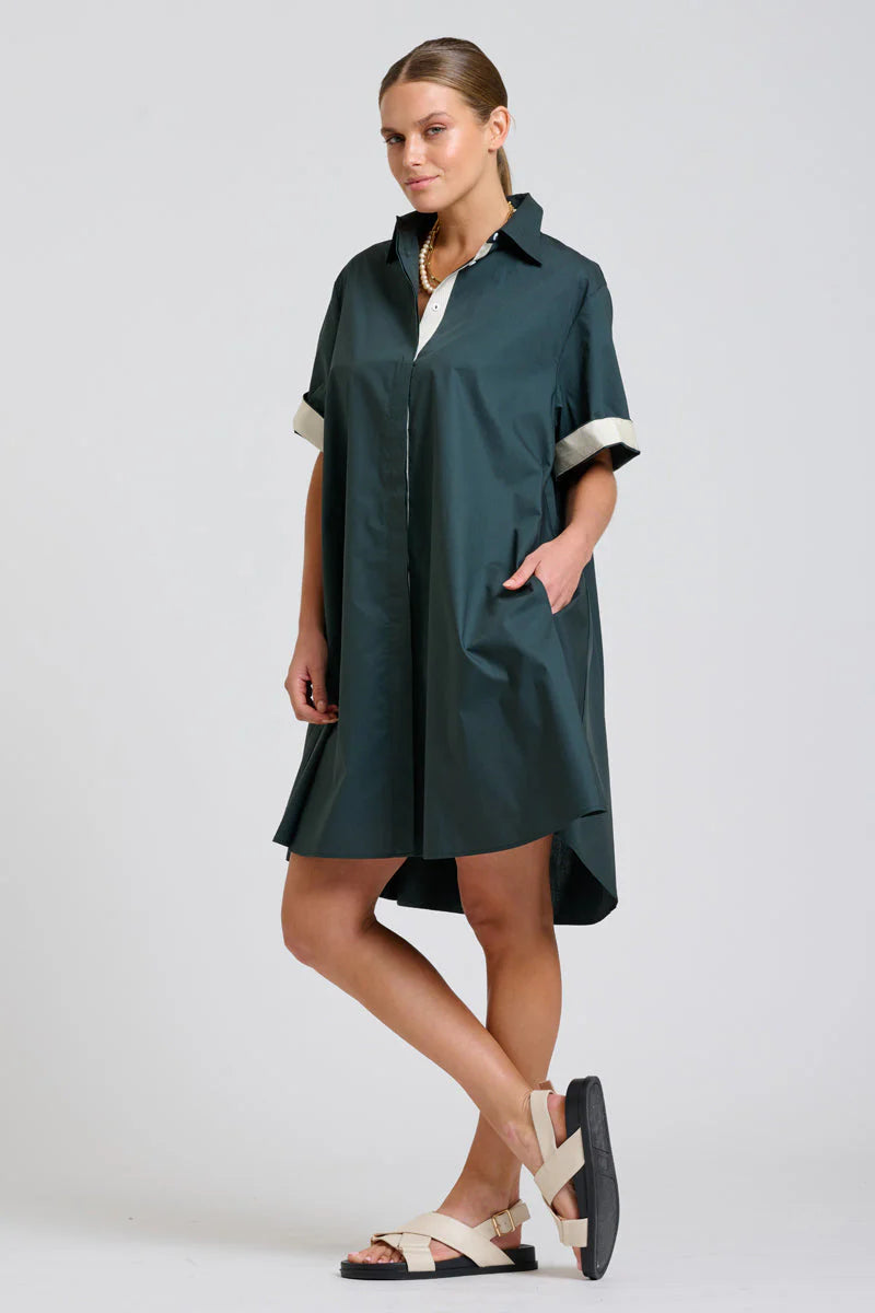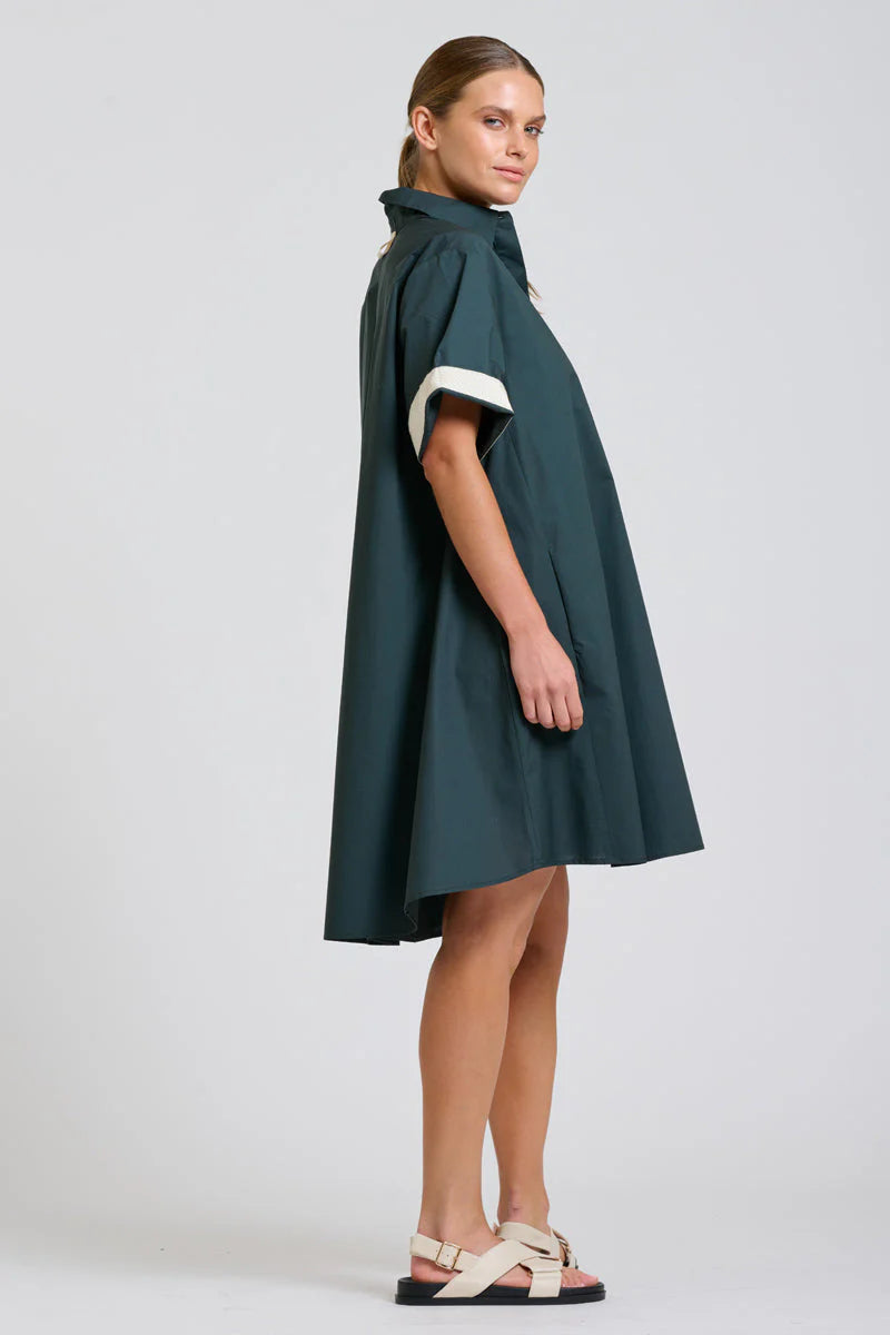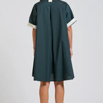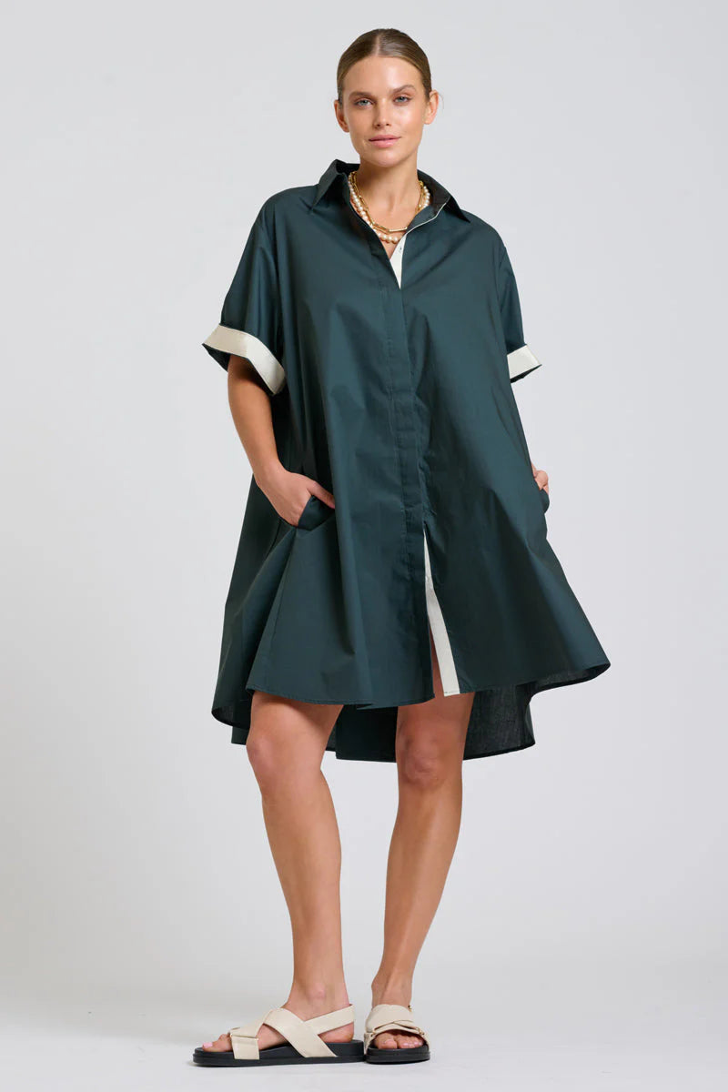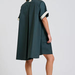A gorgeous voluminous swing style dress, short sleeved with feature ivory grosgrain trims at placket, sleeve and back loop, side pockets, subtle high-low flattering hemline. Dress it up or down, simple style perfected.