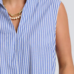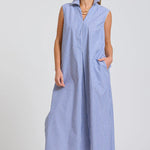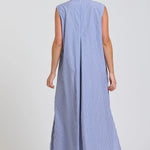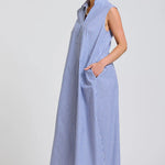 Freya is all class, a sleeveless popover style, featuring a deep v with hook and eye closures, pleat detailing, side splits and of course pockets. She will be on high rotation all summer long.