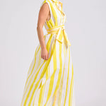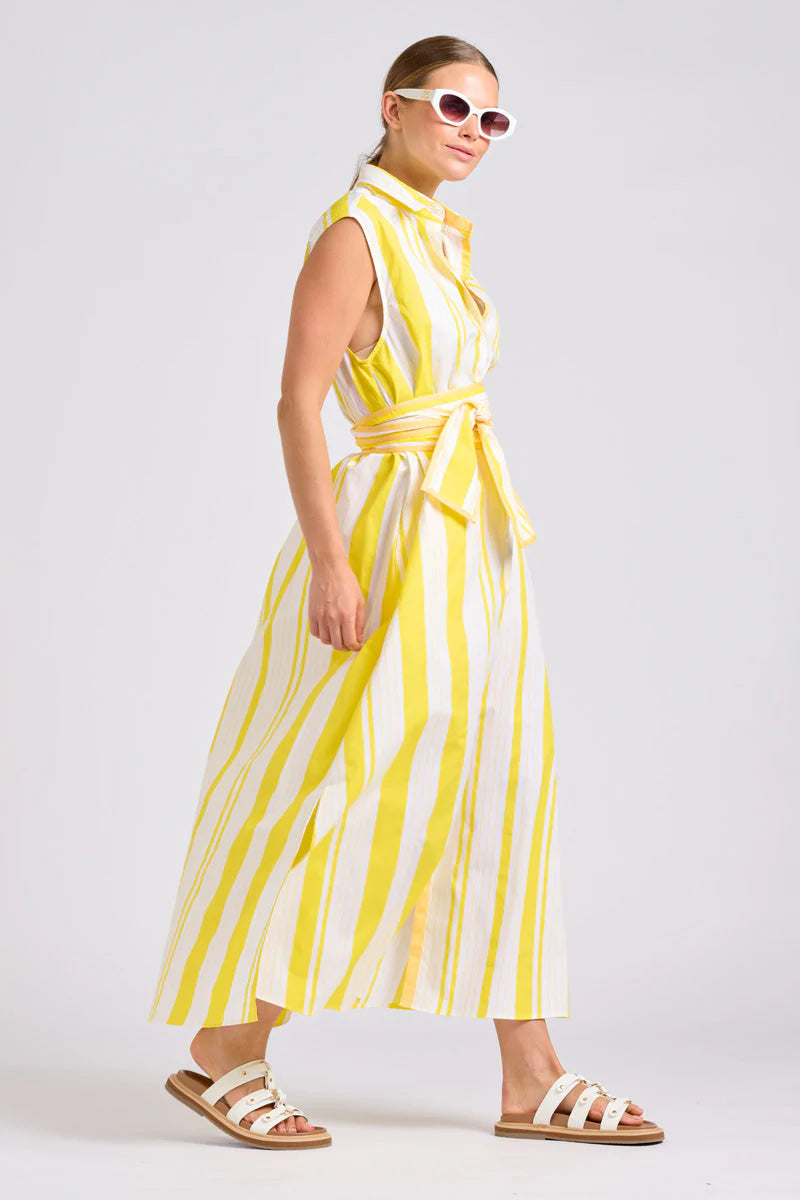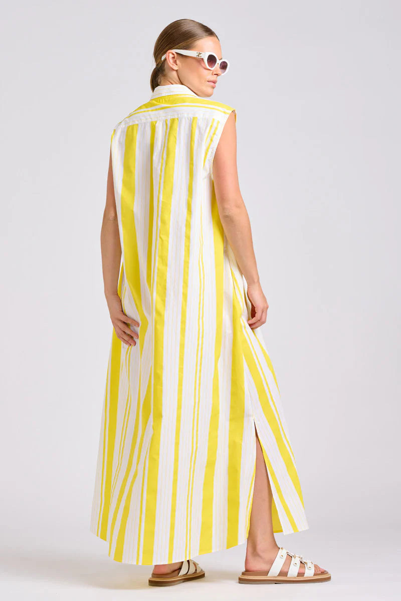 Sophisticated Sabine, an elegant sleeveless, longer-line shirtdress. Crafted from stunning polished