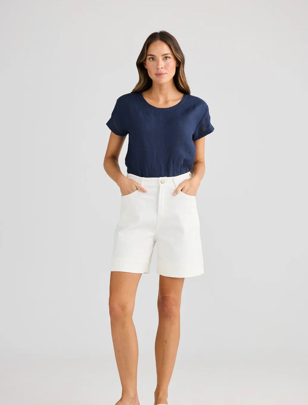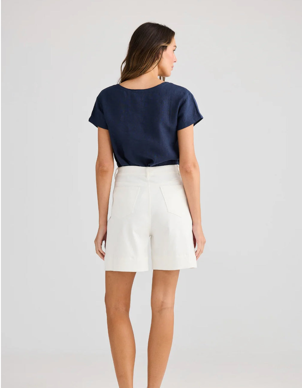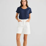 The Vacation Shorts in White from Holiday are a summer wardrobe essential. Designed to sit comfortably on the natural waist, these versatile shorts feature a standard zip fly, a classic 5-pocket design, and a flattering mid-thigh cut. Made from a soft comfort stretch denim, they offer both structure and ease of movement – perfect for everyday wear, travel, or relaxed weekends.