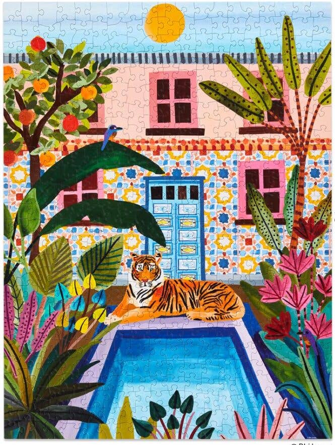Product Description: Escape to a tranquil paradise with the WerkShoppe 500 Piece Puzzle – Oasis, featuring the beautifully detailed artwork of Rhi James. A blend of Moroccan and Indian influences, this scene captures the essence of an exotic retreat, with intricately patterned tiles, lush foliage, and a majestic tiger lounging by a serene pool.